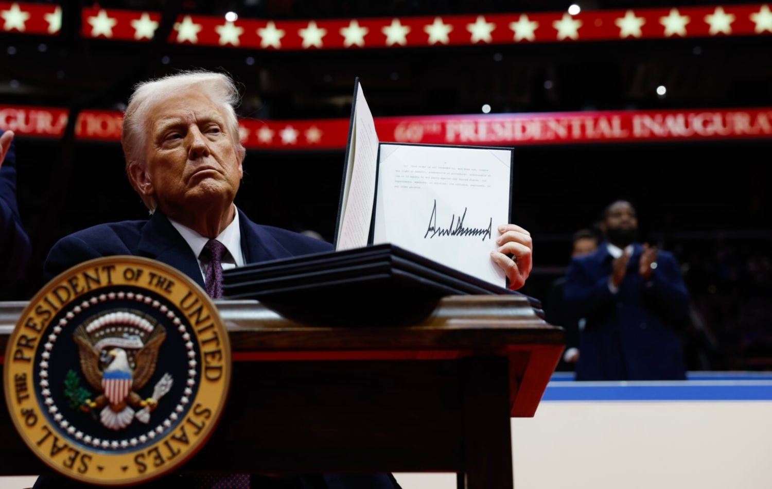 دۆناڵد ترەمپ بڕیارێکی واژۆکراوی بەرزکردووەتەوە لە رێوڕەسمی دەستبەکاربوونیدا، وێنە: Anna Moneymaker-Getty Images