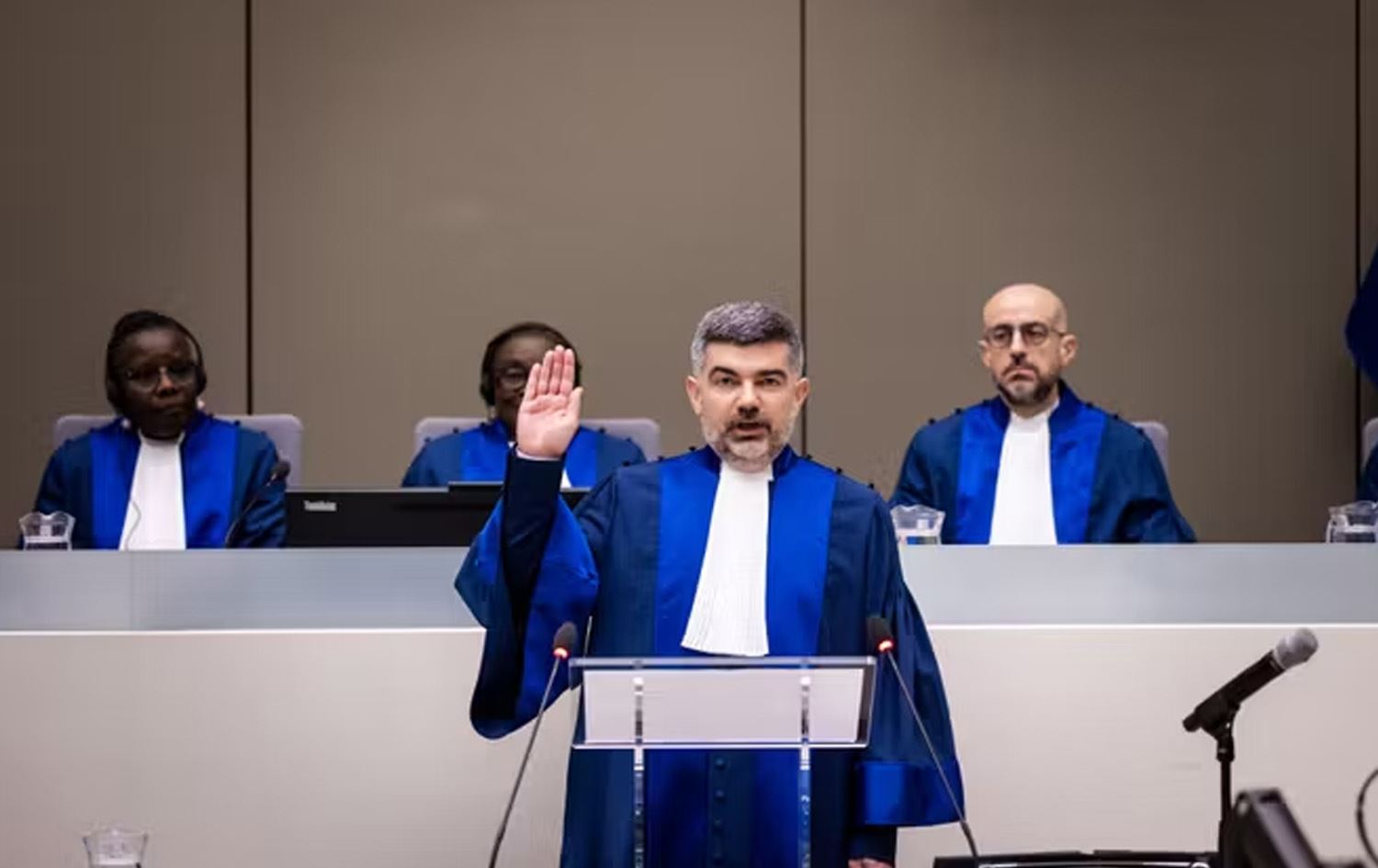 گویو، لەنێو یەکێک لە هۆڵەکانی دادگای تاوانی نێودەوڵەتی لە لاهای دەڵێت، "لێرە دادوەرەکان دادەنیشن، لەلای چەپ نووسینگەی داواکاری گشتییە، لەلای راست تیمی بەرگرییە و لە تەنیشت نووسینگەی داواکاری گشتیشەوە شوێنێک بۆ قوربانییەکان تەرخانکراوە."