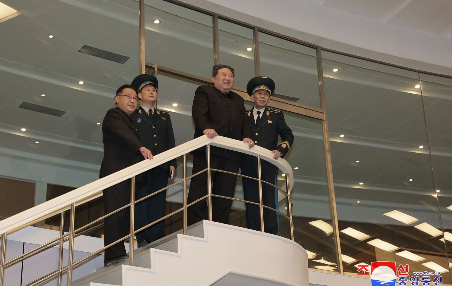 ئاژانسی فەرمیی کۆریای باکووری ئەو وێنەیەی کیم جۆنگ ئوون و چەند فەرماندەیەکی بڵاوکردووەتەوە لەکاتی بەسەرکردنەوەی سەنتەری کۆنترۆڵی ئاسمانیی پیۆنگیانگ