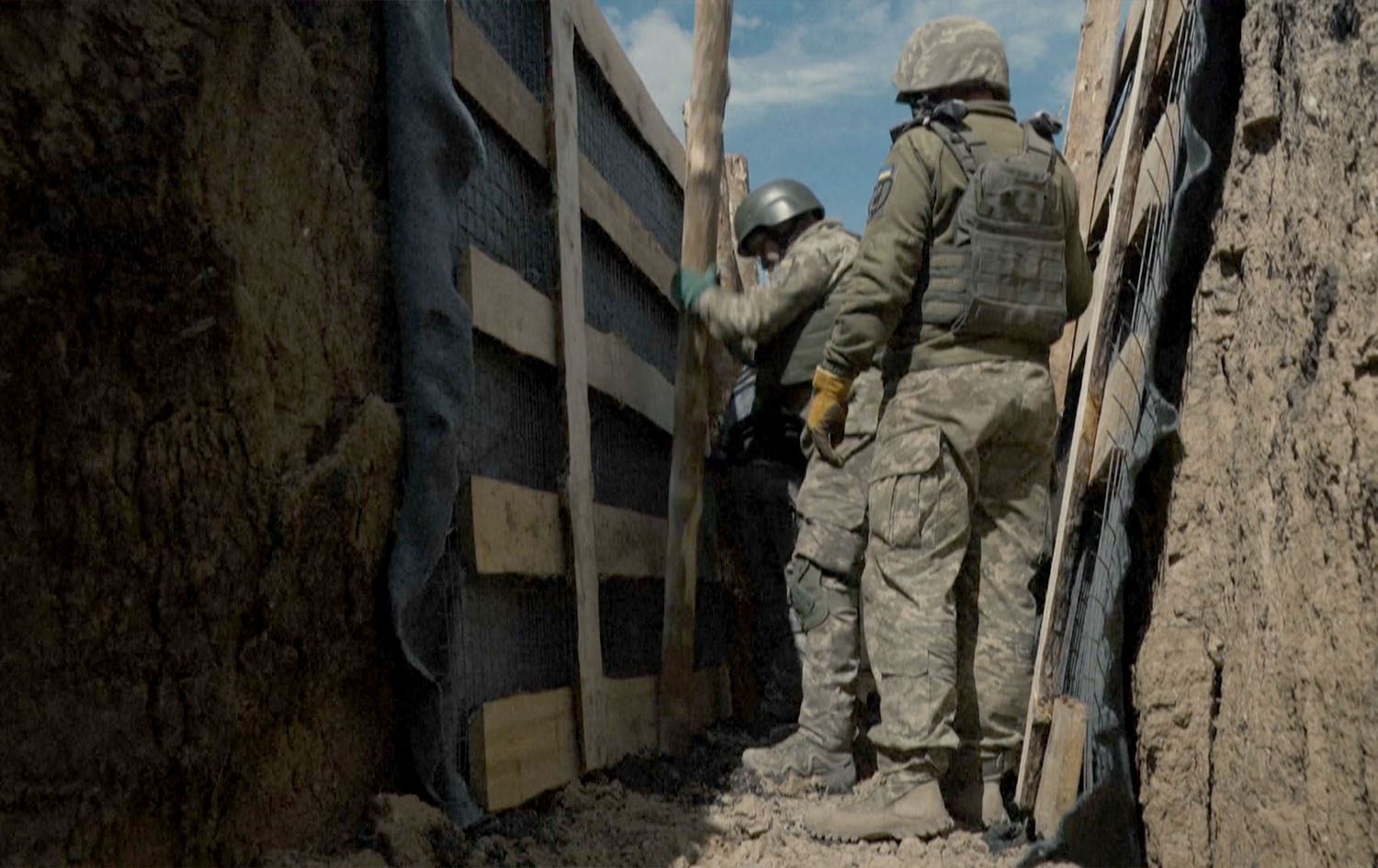 دوو سەربازی ئۆکراینی خەندەقێک تۆکمە دەکەن بۆ رووبەڕووبوونەوەی هێزەکانی رووسیا لە ئەگەری هێرشی کتوپڕ