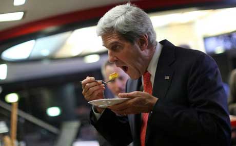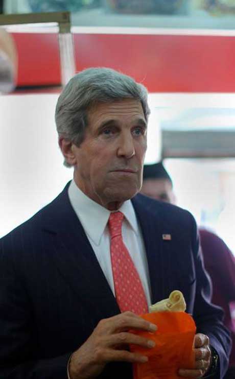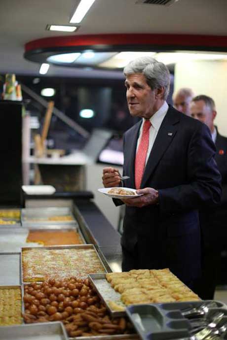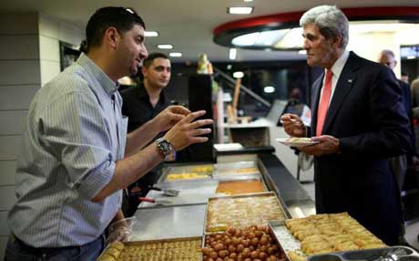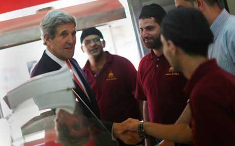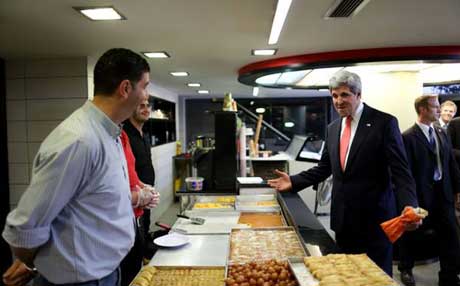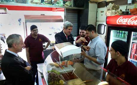جۆن کێری ، وەزیری دەرەوەی ئەمەریکا لە دوکانێکی لەفە لە فەڵەستین لەفە دەخوات