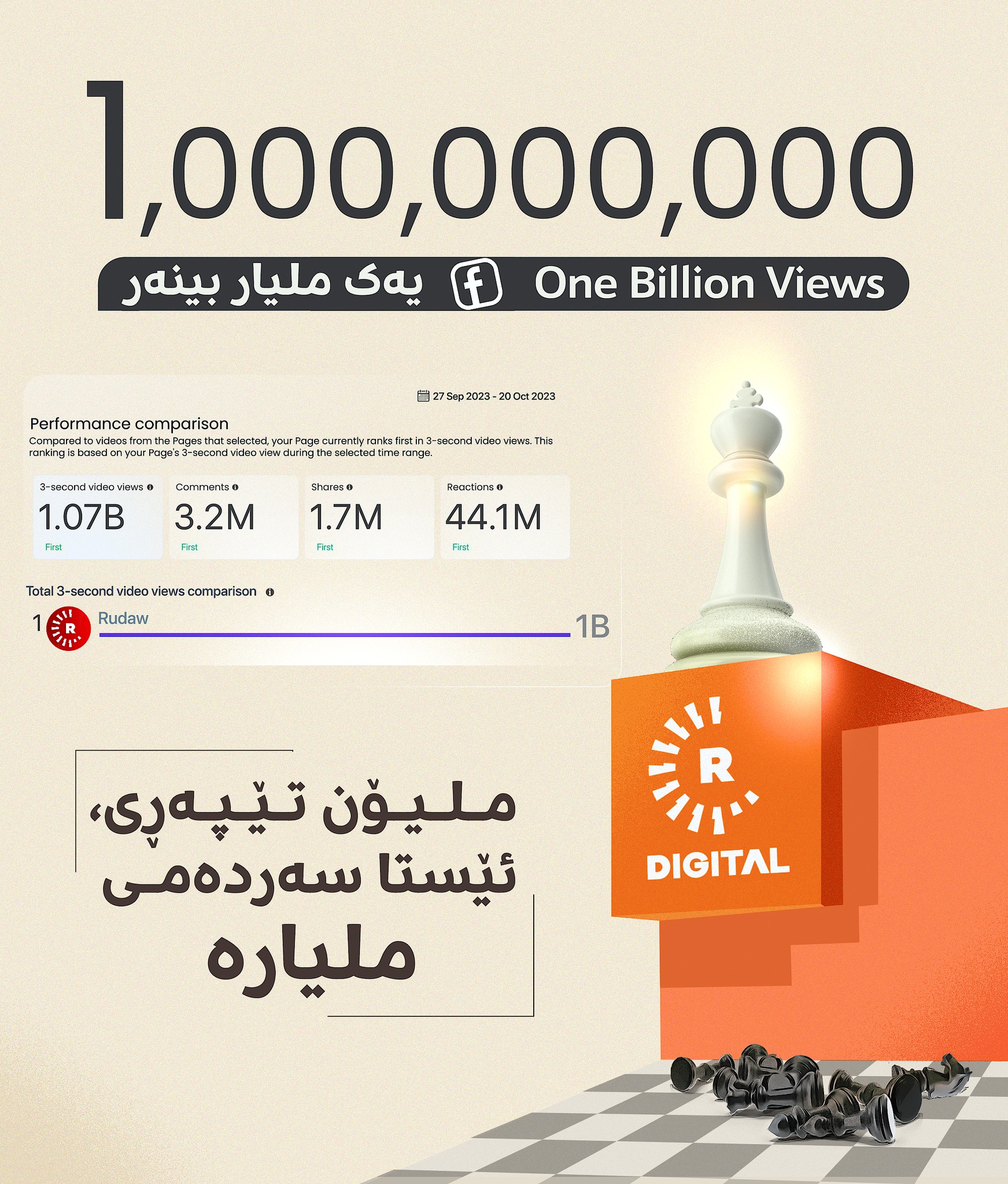 یەکەمین جارە نەک لە عێراق و رۆژهەڵاتی نێوەڕاست، بەڵکو لە تەواوی جیهاندا میدیایەک بینەرەکانی لەو ماوە کەمەدا ملیارێک تێپەڕێنێت. دروشمی رووداو لە کاتی شکاندنی ریکۆردەکە، "ملیۆن تێپەڕی، ئێستا سەردەمی ملیارە" بوو.