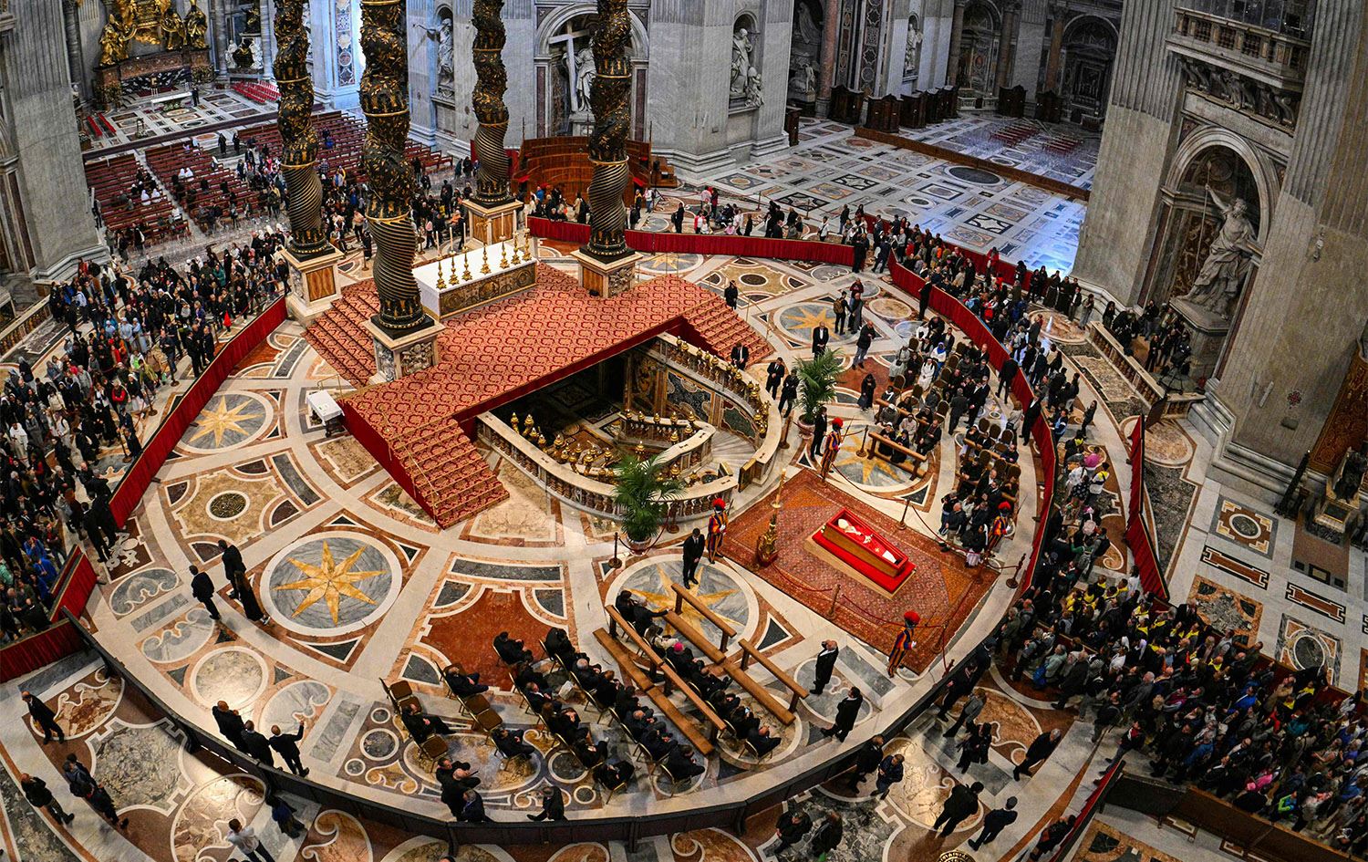تەرمی پاپا فرانسیس لە نێوەڕاستی گۆڕەپانی سان پیتەر، لە بەردەم دەرگەی سەرەکیی کەنیسە بەنێوبانگەکەی ڤاتیکان، دانراوە بۆ ئەوەی خەڵک بۆ دوایین جار ماڵئاوایی لێبکەن پێش ئەوەی بە خاک بسپێردرێت.