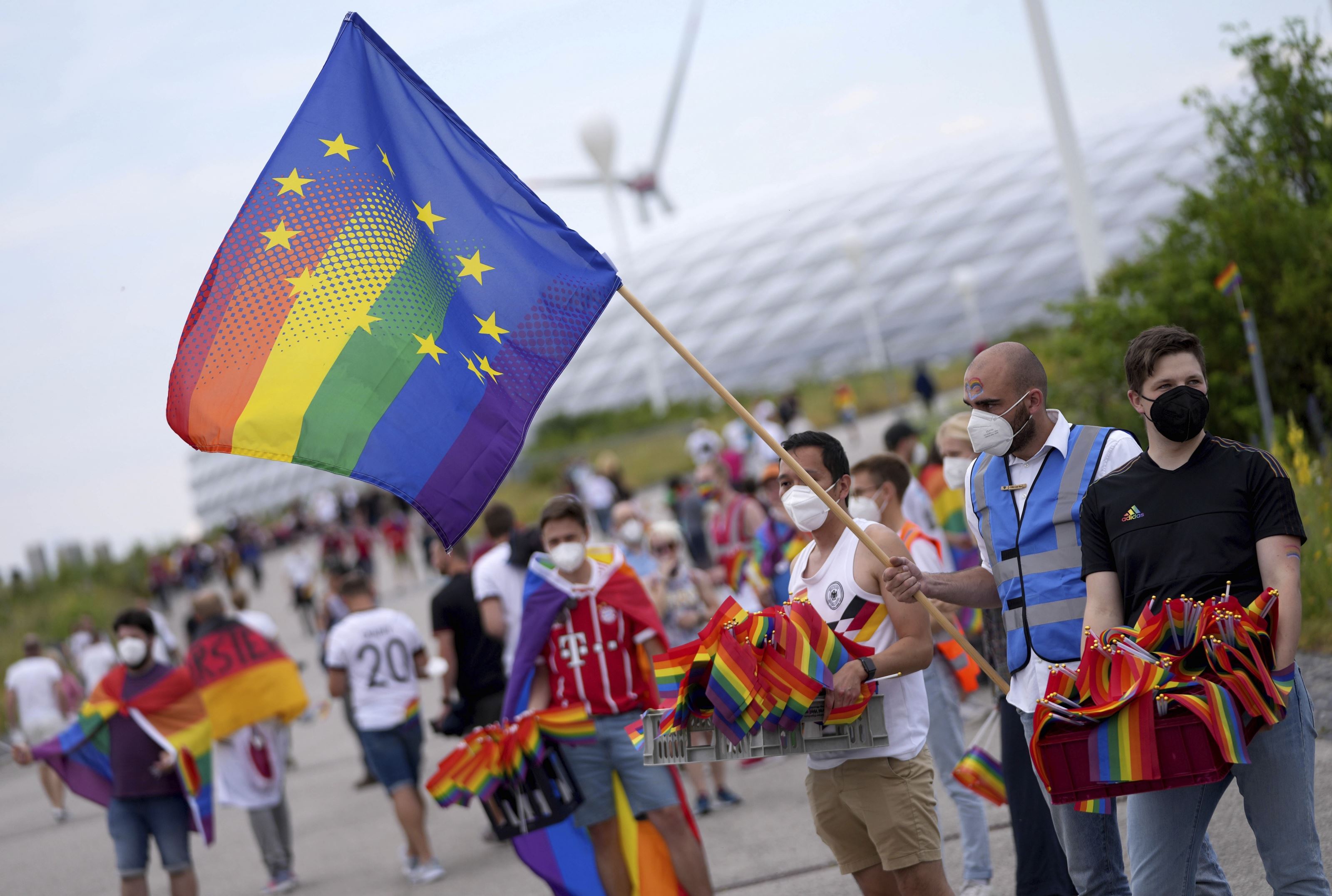 ناڕەزایەتیی بەشێک لە لایەنگرانی مافی هاوڕەگەزخوازان لە پێش یاریی ئەڵمانیا و هەنگاریا. وێنە: AP Photo/Matthias Schrader