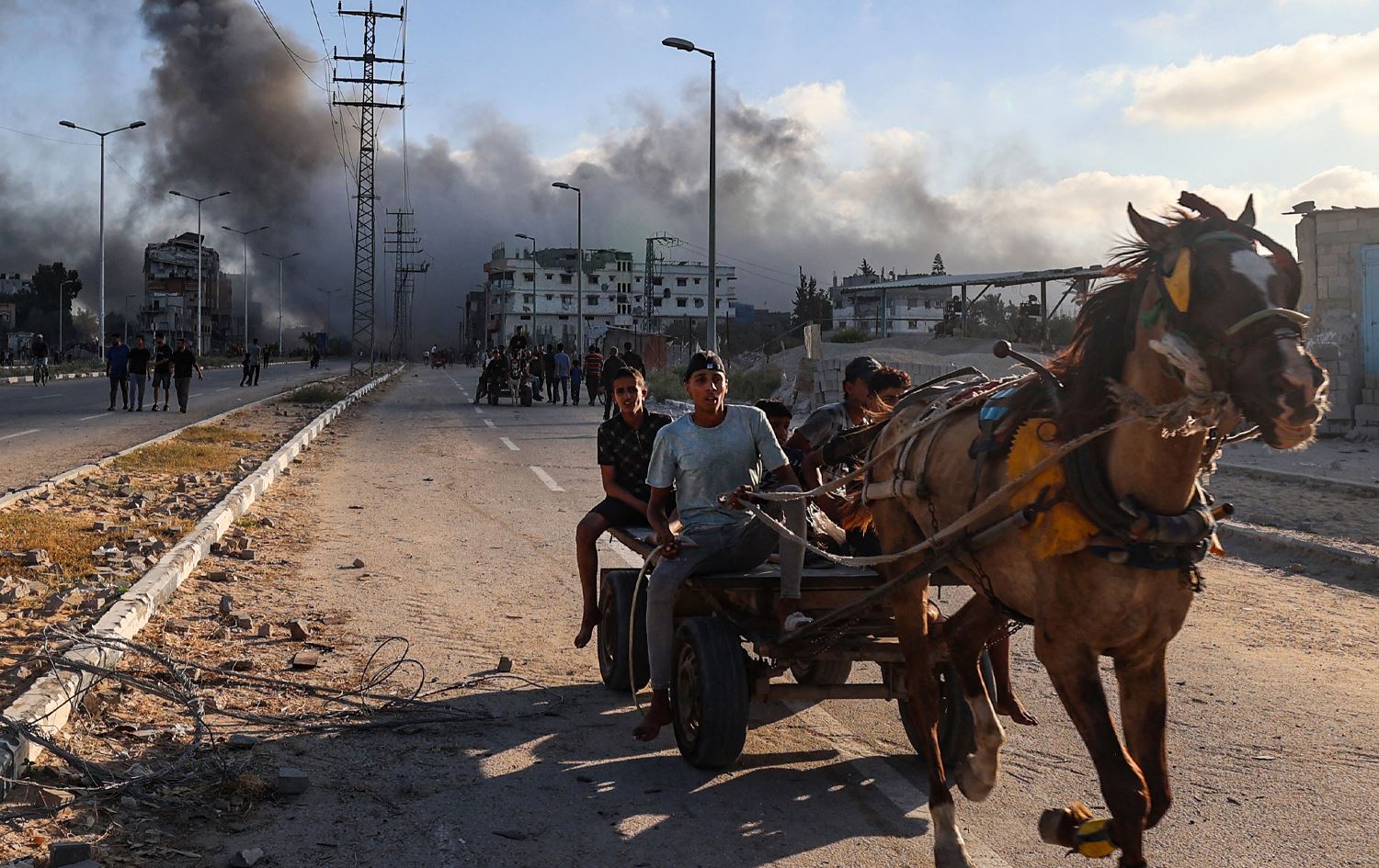 چەند منداڵێک بە ئەسپ و عەرەبانە دەڕۆن و لە دواوەیان دووکەڵی بۆردوومانکردنی شوێنەکە بەرزدەبێتەوە. وێنە: AFP