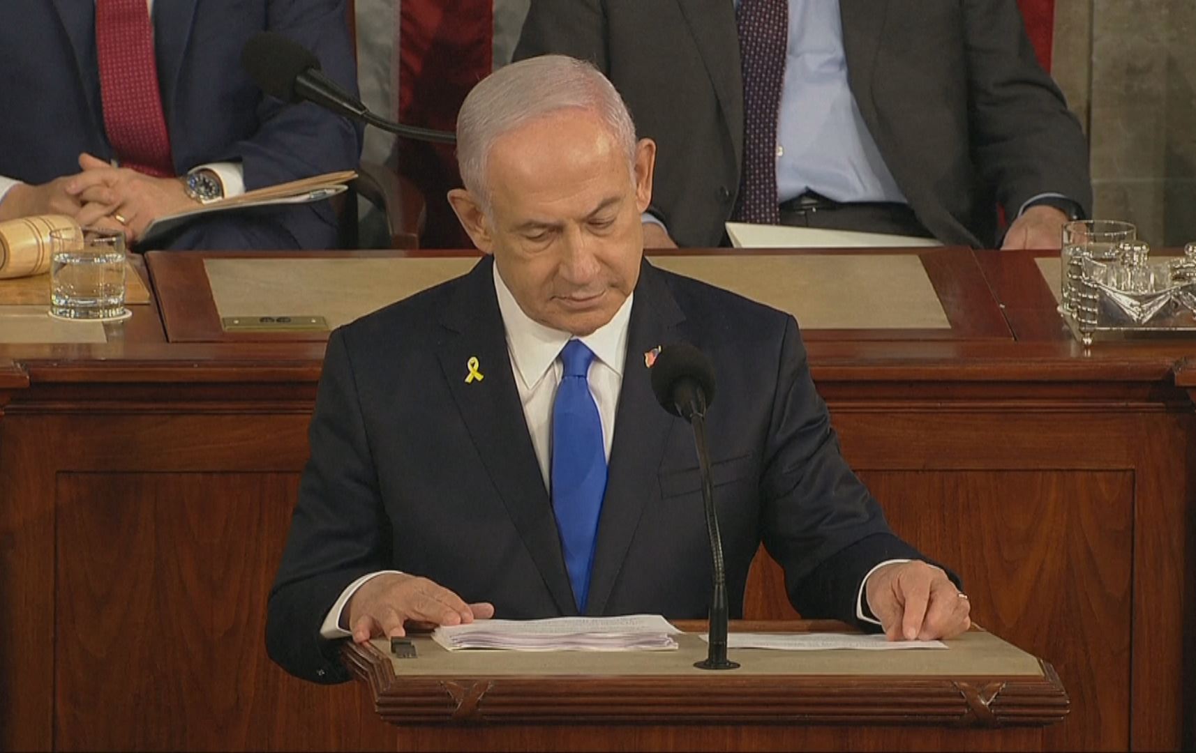لە نێو هۆڵی کۆنگرێس باس باسی ئازادکردنی بارمتەکان و پەیوەندییە پۆڵایینەکەی نێوان ئیسرائیل و ئەمریکا بوو؛ لە دەرەوەش هەزاران خۆپیشاندەر رژابوونە بەردەم باڵاخانەی کۆنگرێس؛ پشتگیریی غەززە و سەرکۆنەی سیاسەتی نەتەنیاهوویان دەکرد.
