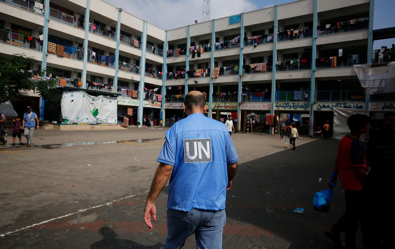 کارمەندێکی نەتەوە یەکگرتووەکان لە کەمپێکی ئاوارەکانی غەززە لە خان یونس. وێنە: AA / Ashraf Amra