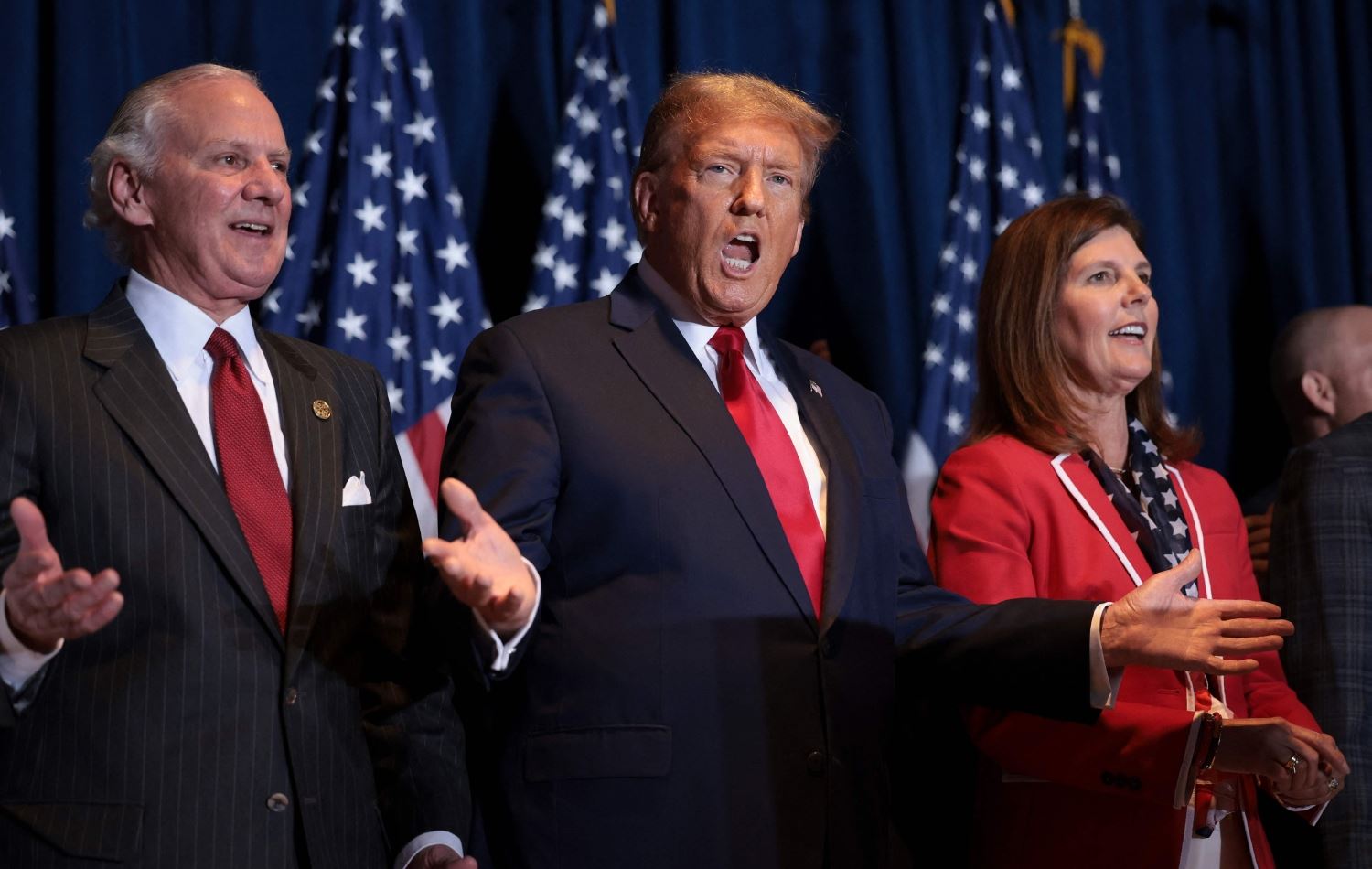 دۆناڵد ترەمپ لەکاتی قسەکردن بۆ لایەنگرانی لە کۆڵۆمبیا، ویلایەتی کارۆلاینای باشوور لە 24-2-2024، وێنە: WIN MCNAMEE / GETTY IMAGES NORTH AMERICA / AFP