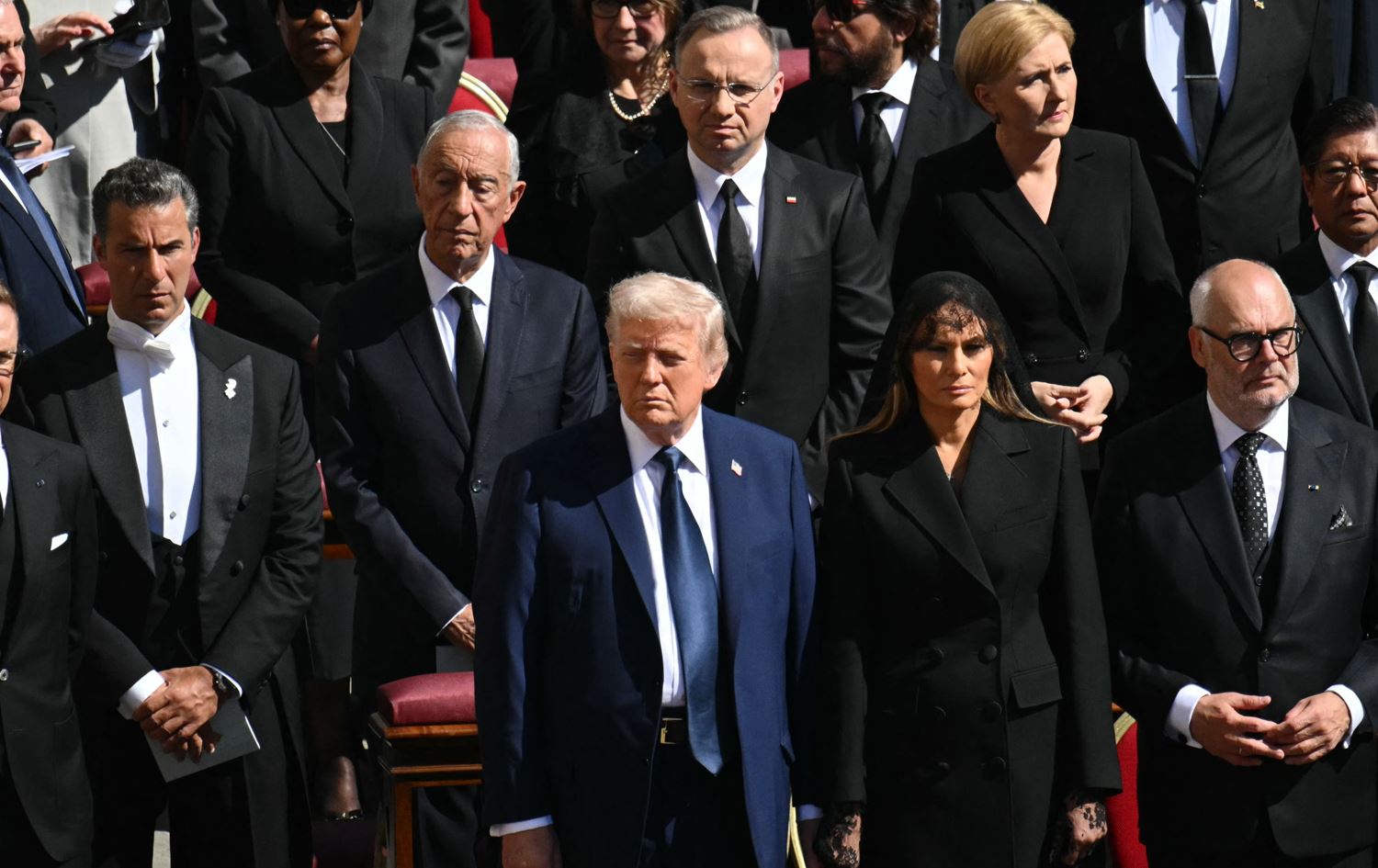 ترەمپ لەگەڵ سەرکردەکانی جیهان لە حەوشەی کەنیسەی سان پیتەر لە بەردەم تابووتی پاپا وەستان. هەموو سەرکردەکان قات و بۆینباخی رەشیان لەبەردابوو، جگە لە ترەمپ کە شینێکی کراوەی لەبەربوو.