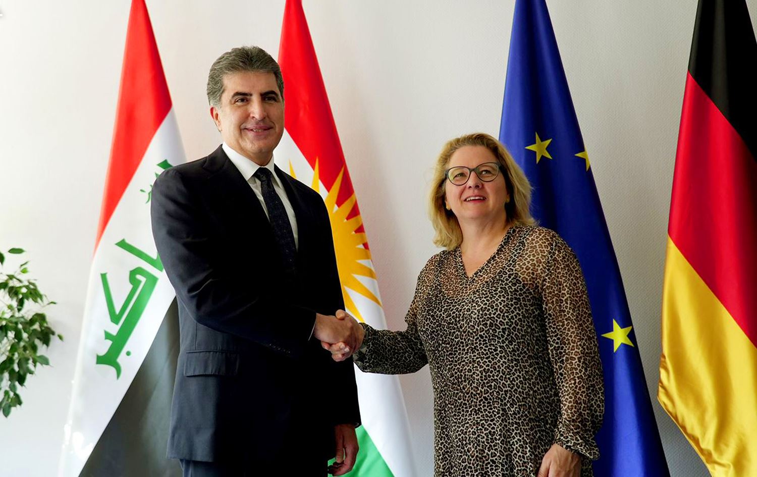 نێچيرڤان بارزانى، سهرۆكى ههرێمى كوردستان و سڤينيا شوولتز، وهزيرى هاريكاريى ئابوورى و پهرهپێدانى ئهڵمانيا