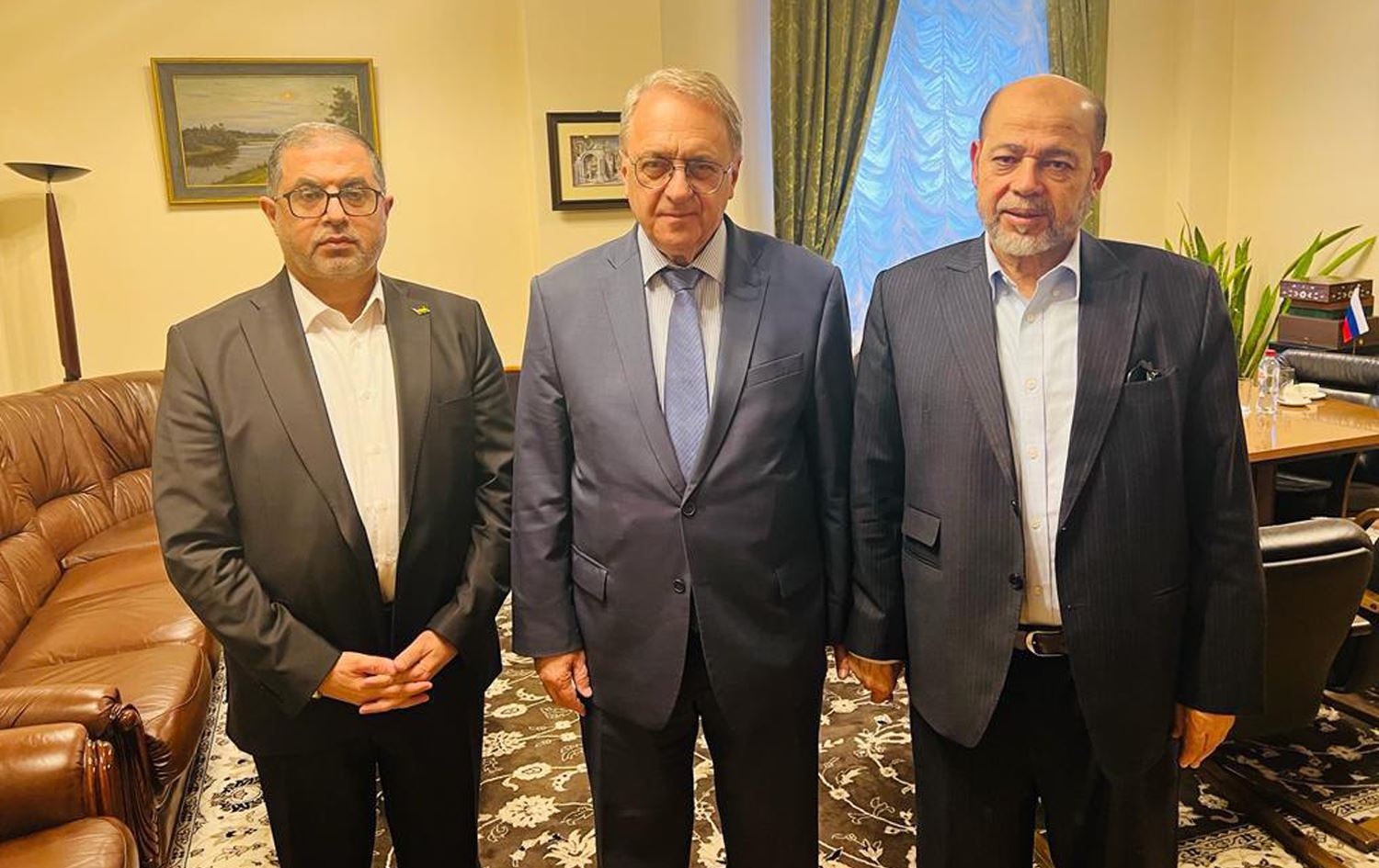 لە راستەوە بۆ چەپ: مووسا ئەبو مەرزووق، سەرکردەی باڵای حەماس؛ میخائیل بۆگدانۆڤ، نوێنەری پووتین و عەلی باقری، جێگری وەزیری دەرەوەی ئێران.