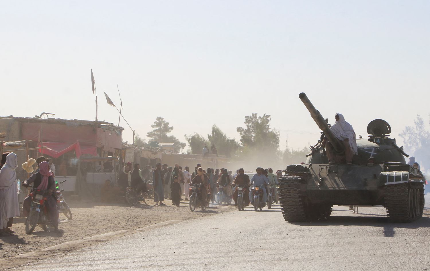 چەکدارێکی تاڵیبان لە ئەفغانستان لەنزیک سنووری وڵاتەکەی لەگەڵ پاکستان بەسەر تانکێکەوەیە. وێنە: REUTERS