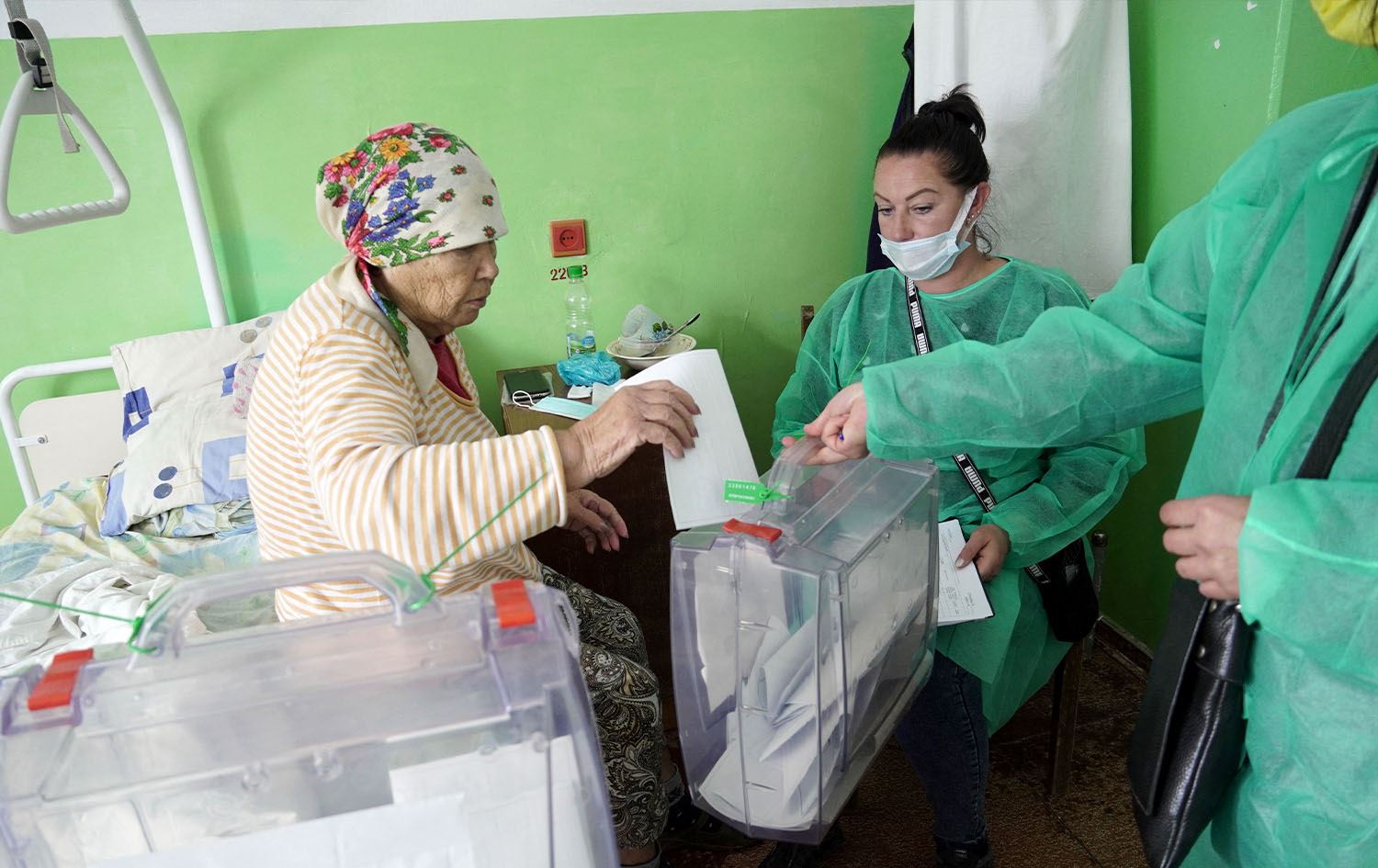ژنێک لە نەخۆشخانەیەکی ناوچەیەکی ژێر دەسەڵاتی رووسیا لە ئۆکراینا بەشداریی گشتپرسی دەکات. وێنە: AFP