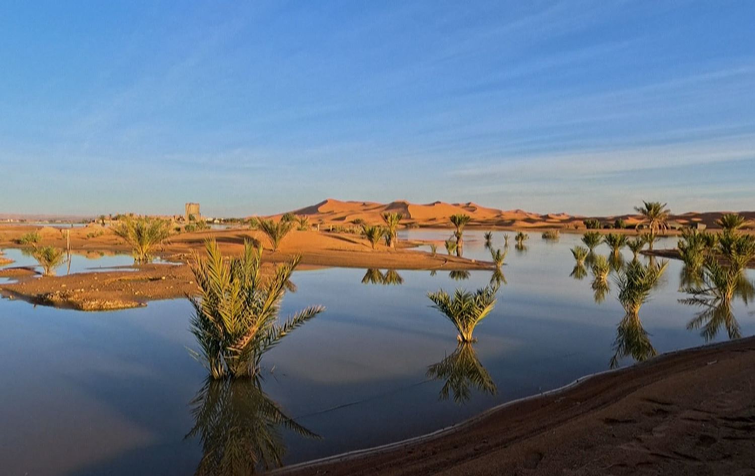 باران، دوای چەندین ساڵ دەریاچەیەکی وشکبووی لە بیابانی شاری مێرزووگا لە مەغریب زیندووکردووەتەوە.