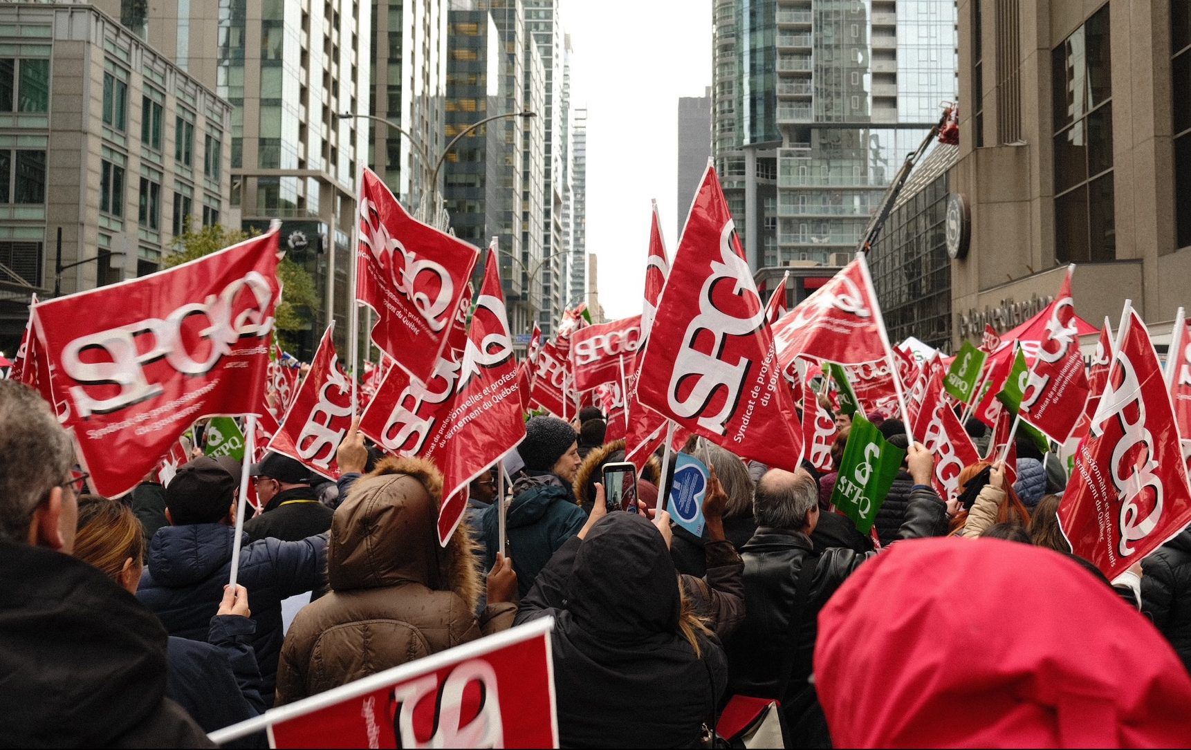 لە شاری مۆنتریال چەندین فەرمانبەر لە دەرەوەی قوتابخانەیەک گردبوونەوە و ئاڵای نەتەوە یەکگرتووەکانیان بەرزکردەوە، لە بەشێک لە دروشمەکانیان نووسرابوو، "هەڵاوسان ئێمە هەژارتر و خاوەنکارەکان دەوڵەمەندتر دەکات" و "پاترییەکانمان وزەیان تێدا نەماوە".