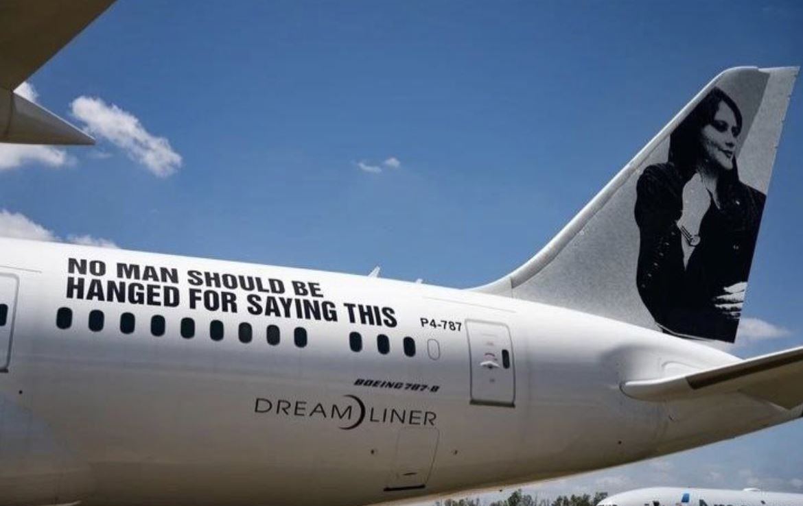 دەرهێنەرە ئەرجەنتینییەکە ڤیدیۆیەکی لە تۆڕی کۆمەڵایەتی ئێکس بڵاوکردووەتەوە، کە وێنەکەی ژینا ئەمینی و ئەمین نەسرئازادی و دروشمەکە لەسەر فڕۆکەکەی دەسڕێتەوە.