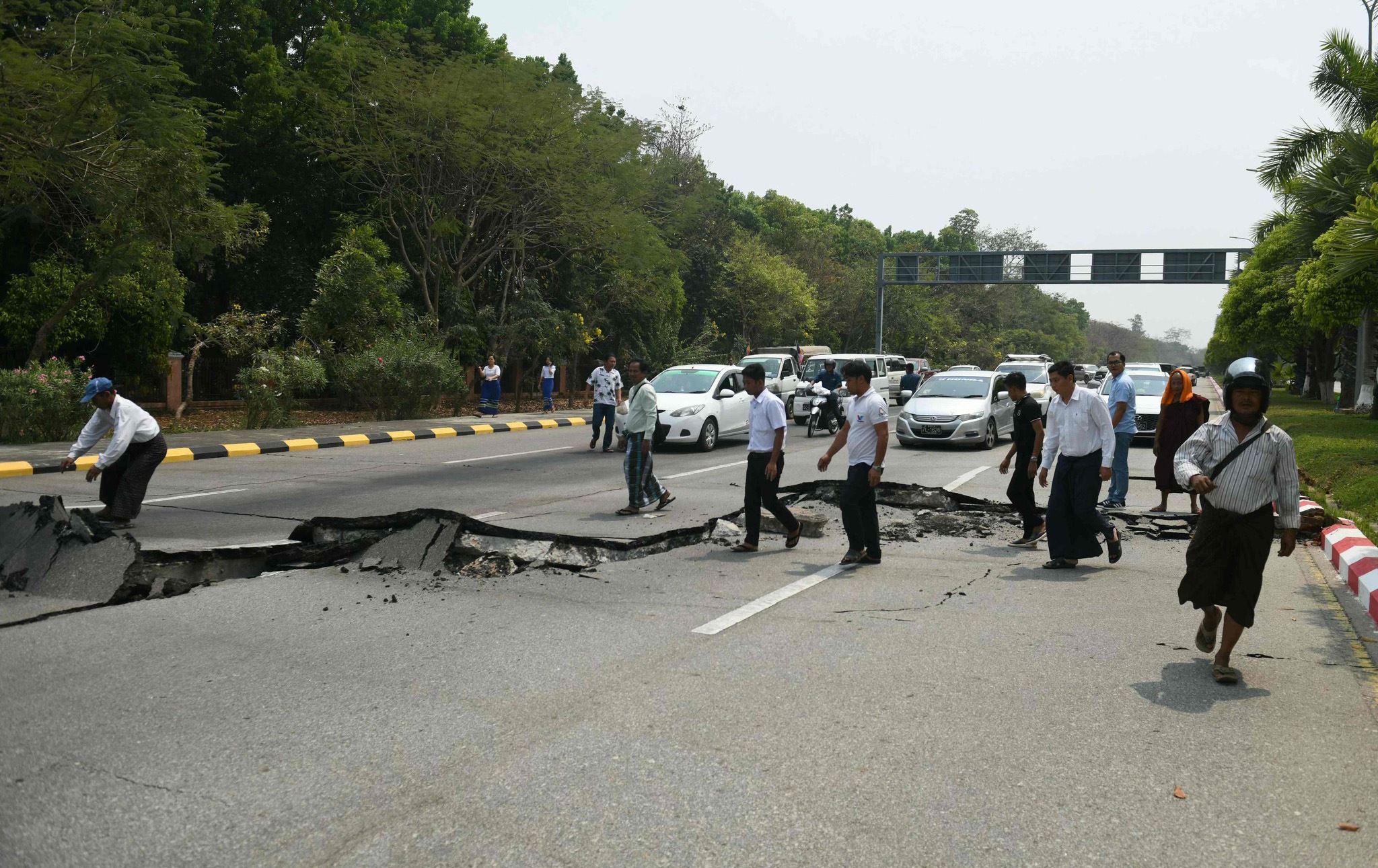 دیمەنی شەقامێکی میانمار کە بەهۆی بەهێزیی بوومەلەرزەوە درزی بردووە. وێنەکە 28-3-2025 گیراوە: AFP