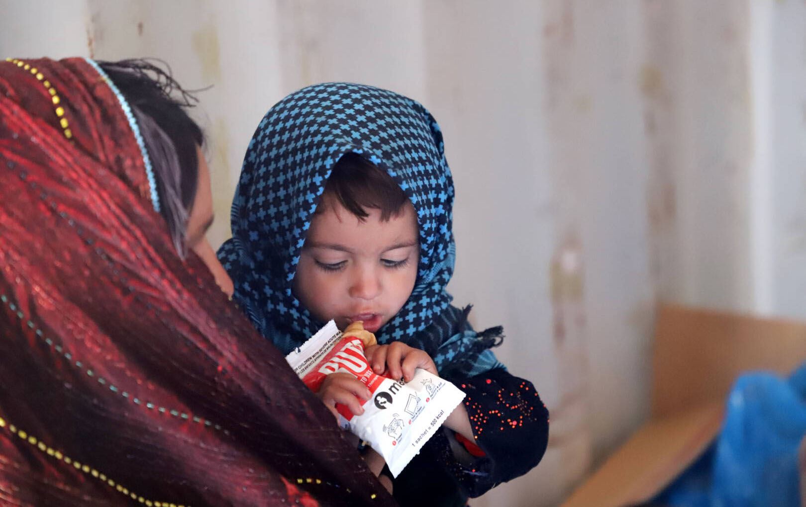 منداڵێک ئەو پسکیتە دەخوات کە لەلایەن رێکخراوەکانەوە دابینکراوە بۆ رووبەڕووبوونەوەی بەدخۆراکی. وێنە: World Vision