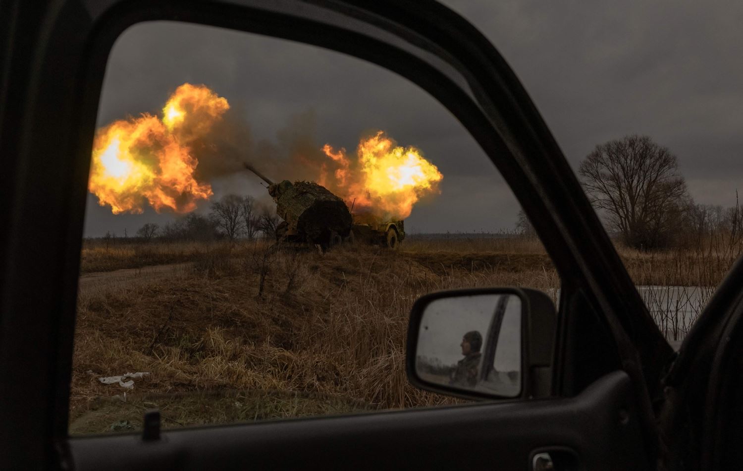 دیمەنی ئۆتۆمبێلێکی سەربازیی ئۆکراینا لەکاتی هەڵدانی مووشەک بە ئاراستەی هێزەکانی رووسیا لە 2-1-2024، وێنە: Roman PILIPEY / AFP