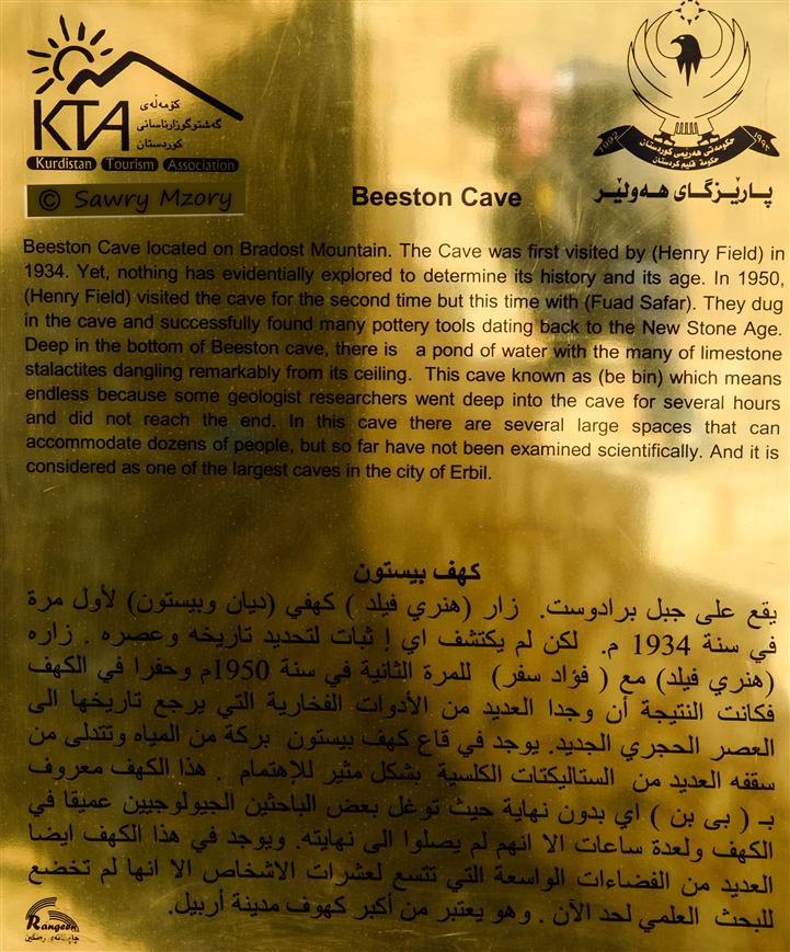 لەسەر چیای برادۆست و باکووری خۆرئاوای شاری هەولێر بە دووری (97کم ) بە دوو رێگای قیرتاو کراو دەگەیتە ئەم ئەشکەوتە یەکێکیان لە بەرزایی چیای سپیلک بەرەو دۆڵی خەلان و بناوێ لەوێشەوە بەرەو بەرزایی چیای برادۆست. دووەمیان لە کۆتایی گەلی علی بەگ بە رێگایەکی کە بەرەو خۆرئاوا دەڕوات لە نێوان (هاودیان _سارداو) دا رێگایەکی لاوەکی بەرەو بەرزایی چیای برادۆست سەردەکەوی تا دەگەیتە ئەشکەوتی بێستون. دەکەوێتە سەر رێگاکەو دەرگاکەی نزمەو لە ژوورەوە زۆر فراوانە کۆتایی دیار نییە ، لەسەر ئەشکەوتەکەشدا کونێک هەیە رووناکی دەداتە بەشێکی ئەشکەوت، زیاتر لە 100م درێژ و 40م پان و 10م بەرز دەبێت، سەدان بلوری کریستالی لە ناویدا شۆربوونەتەوە و بەسەرکەوتوون، کریستالەکان جۆراو جۆرن و دیمەنێکی سەرنجراکێشیان دروست کردووە.