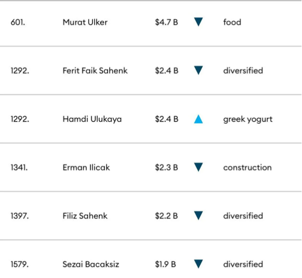 Türkiye'de listede ikinci sırada 2,4 milyar dolarlık servetiyle Ferit Şahenk yer aldı. 2021 yılında 3 milyar dolarlık servete sahip olan Şahenk, 2022 listesinde 1292'nci sırada yer buldu.
