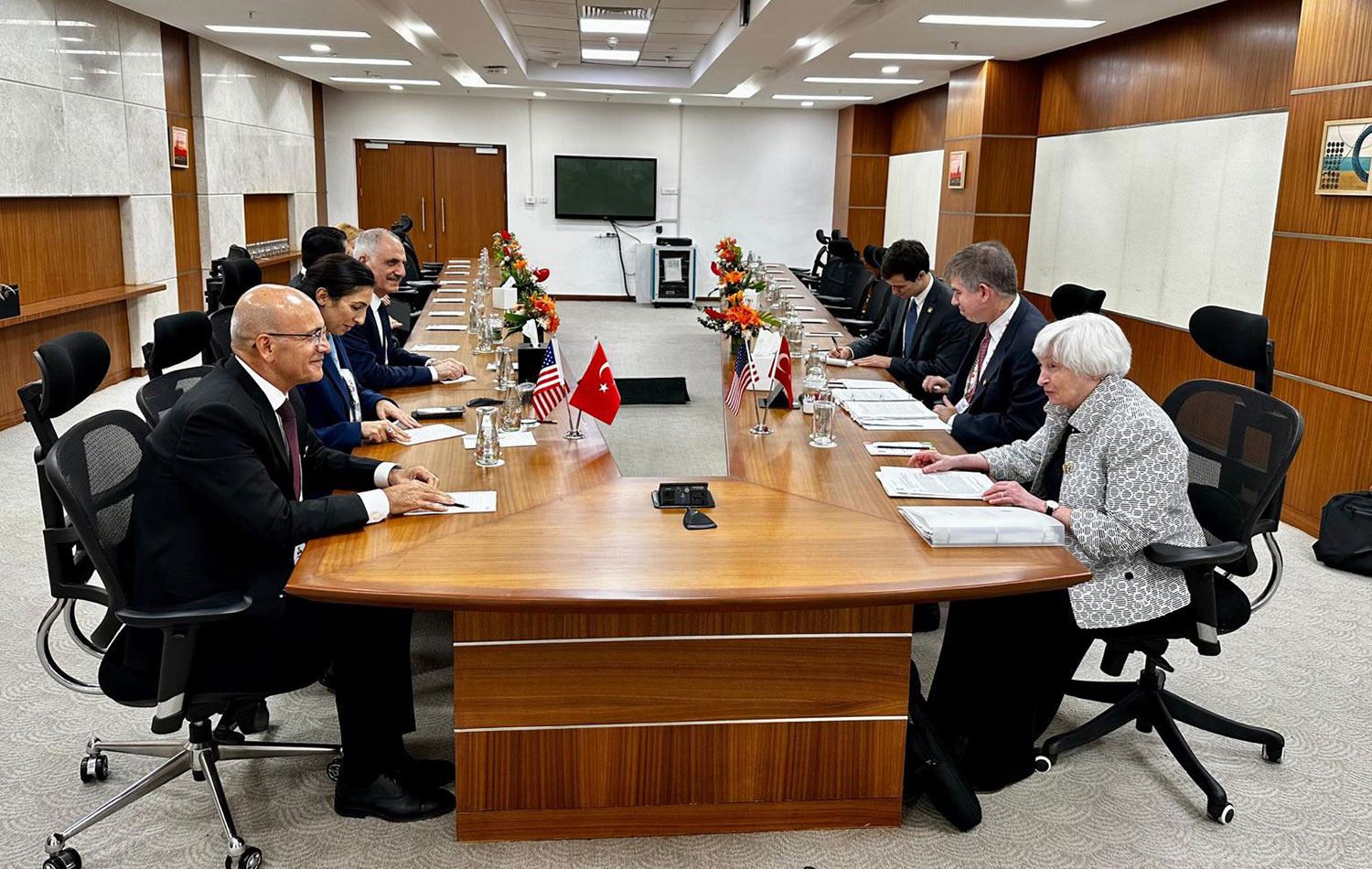 Hindistan'da düzenlenen G20 toplantılarında Türkiye'yi temsil eden Şimşek, buradaki temasları kapsamında ABD Hazine Bakanı Yellen ile heyetler arası görüşme gerçekleştirdi.