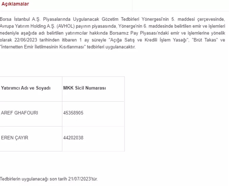 Hürriyet'in haberine göre Borsa İstanbul'dan yapılan açıklamada, "Borsa İstanbul A.Ş. Piyasalarında Uygulanacak Gözetim Tedbirleri Yönergesi'nin 5. maddesi çerçevesinde, Avrupa Yatırım Holding A.Ş. (AVHOL) payının piyasasında, Yönerge'nin 6. maddesinde belirtilen emir ve işlemleri nedeniyle Aref Ghafouri ve Eren Çayır adlı yatırımcılar hakkında Borsamız Pay Piyasası'ndaki emir ve işlemlerine yönelik olarak 22/06/2023 tarihinden itibaren 1 ay süreyle "Açığa Satış ve Kredili İşlem Yasağı", "Brüt Takas" ve "İnternetten Emir İletilmesinin Kısıtlanması" tedbirleri uygulanacaktır" denildi.