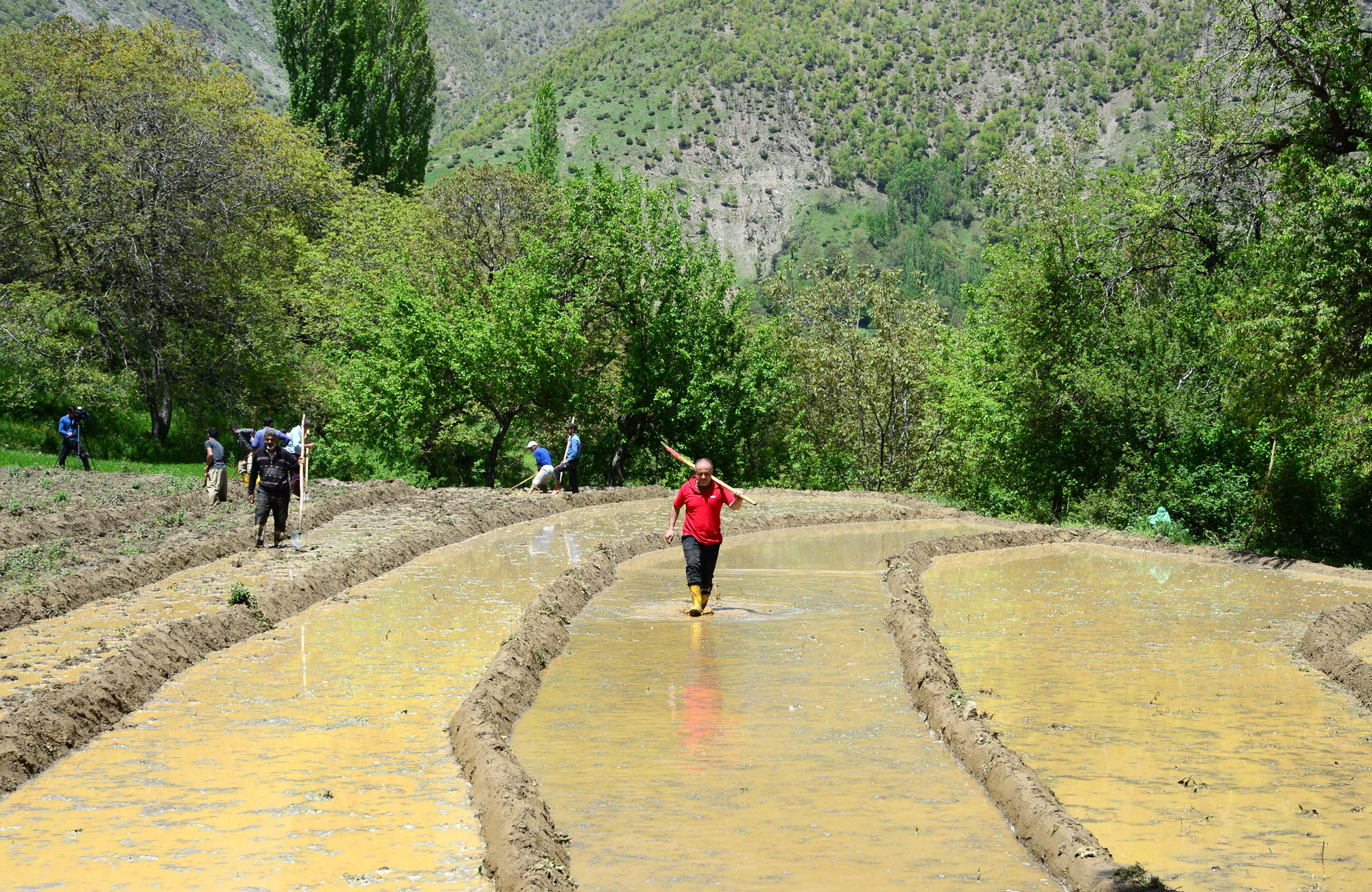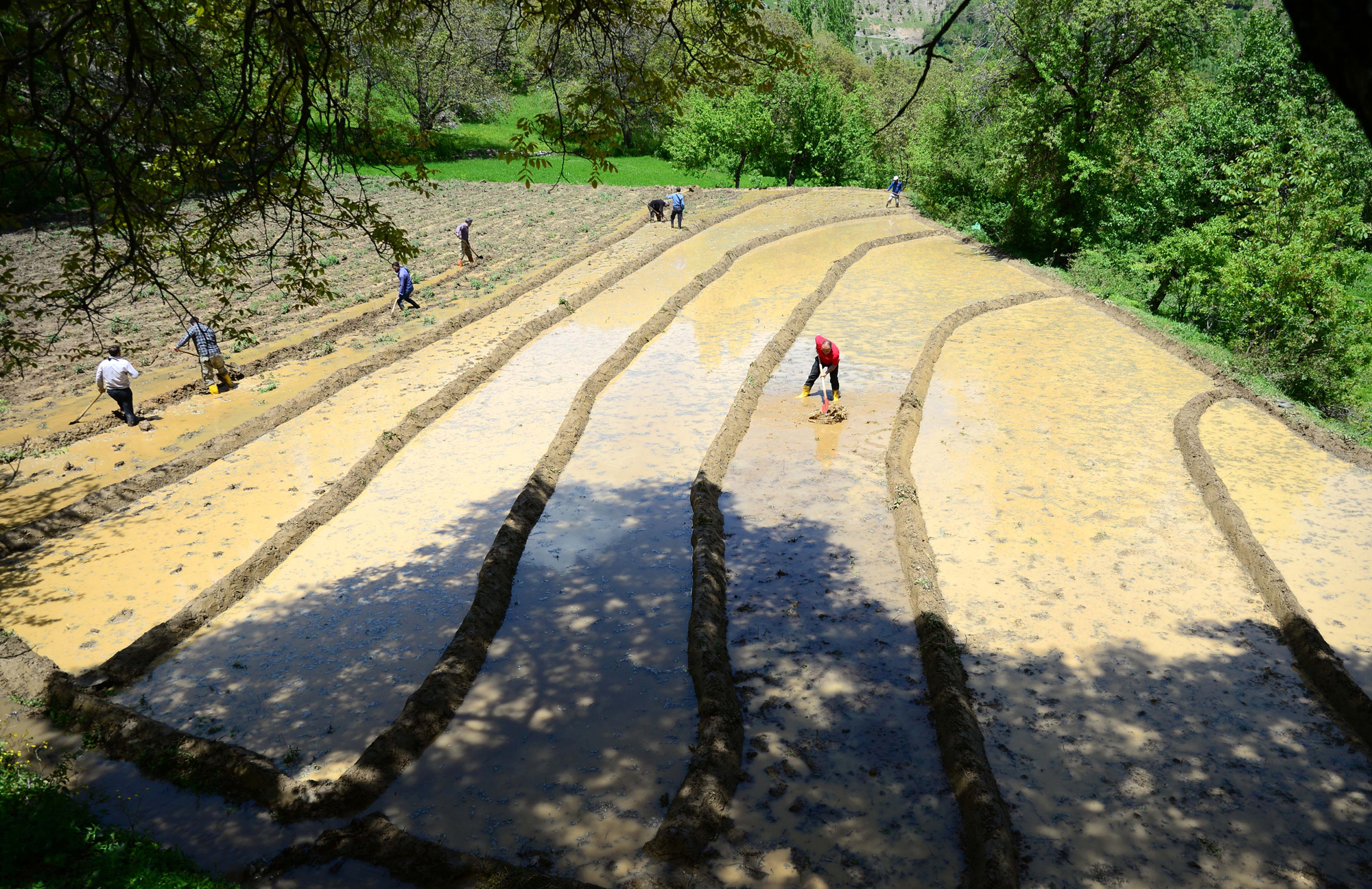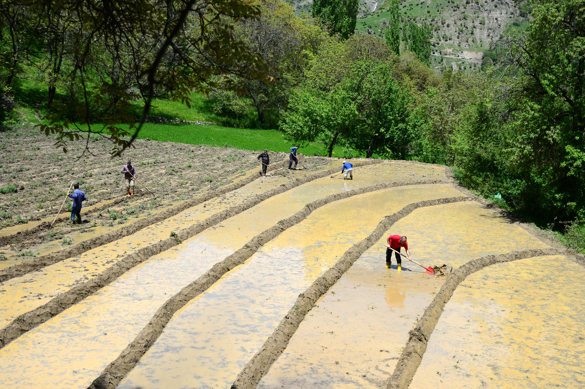 Yüksek rakımlı dağların dik yamaçlarında yer alan köy ve mezralardaki vatandaşlar, atalarından kalma geleneksel yöntemlerle güneşin altında imece usulüyle pirinç ekiyor.