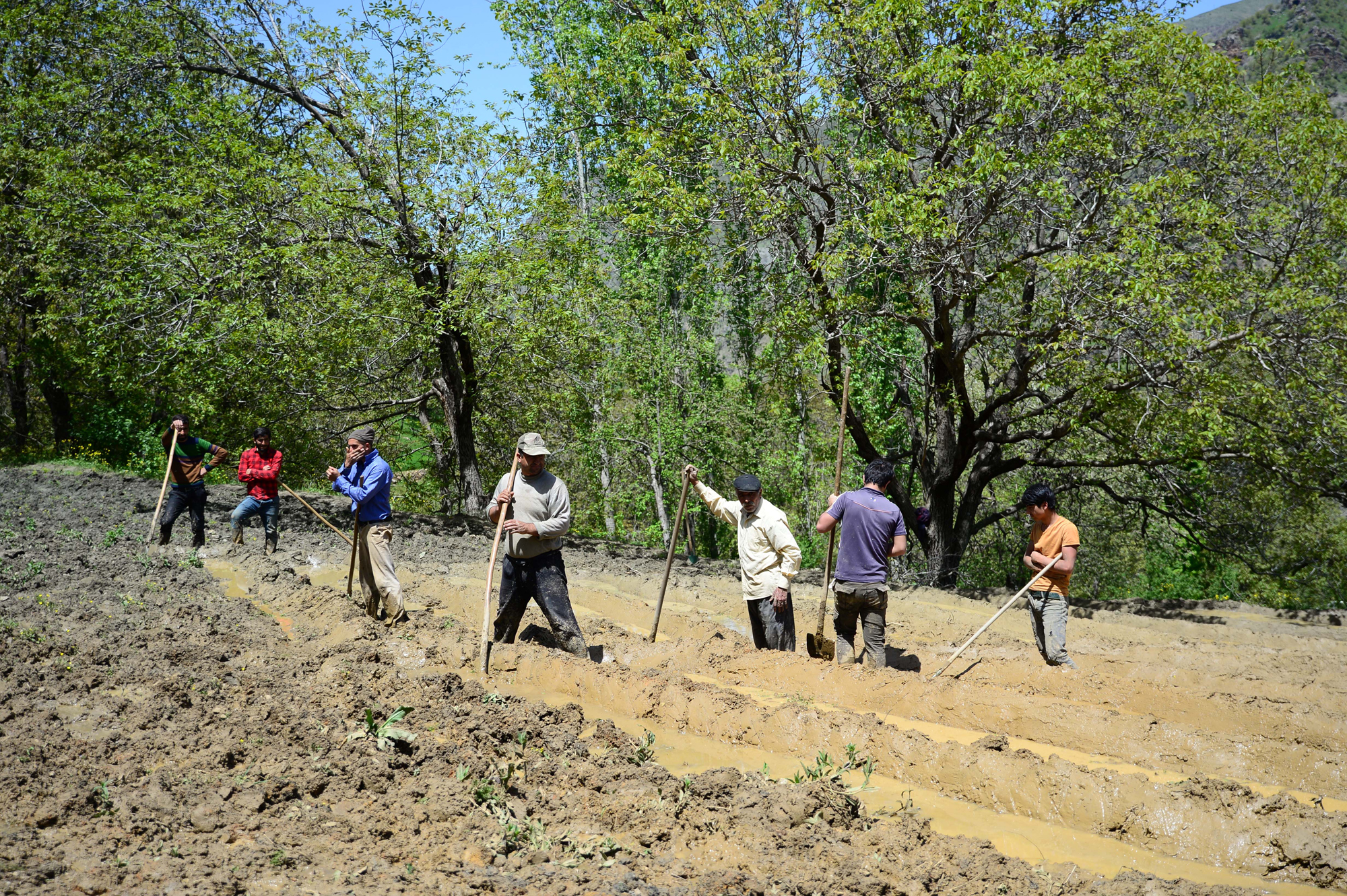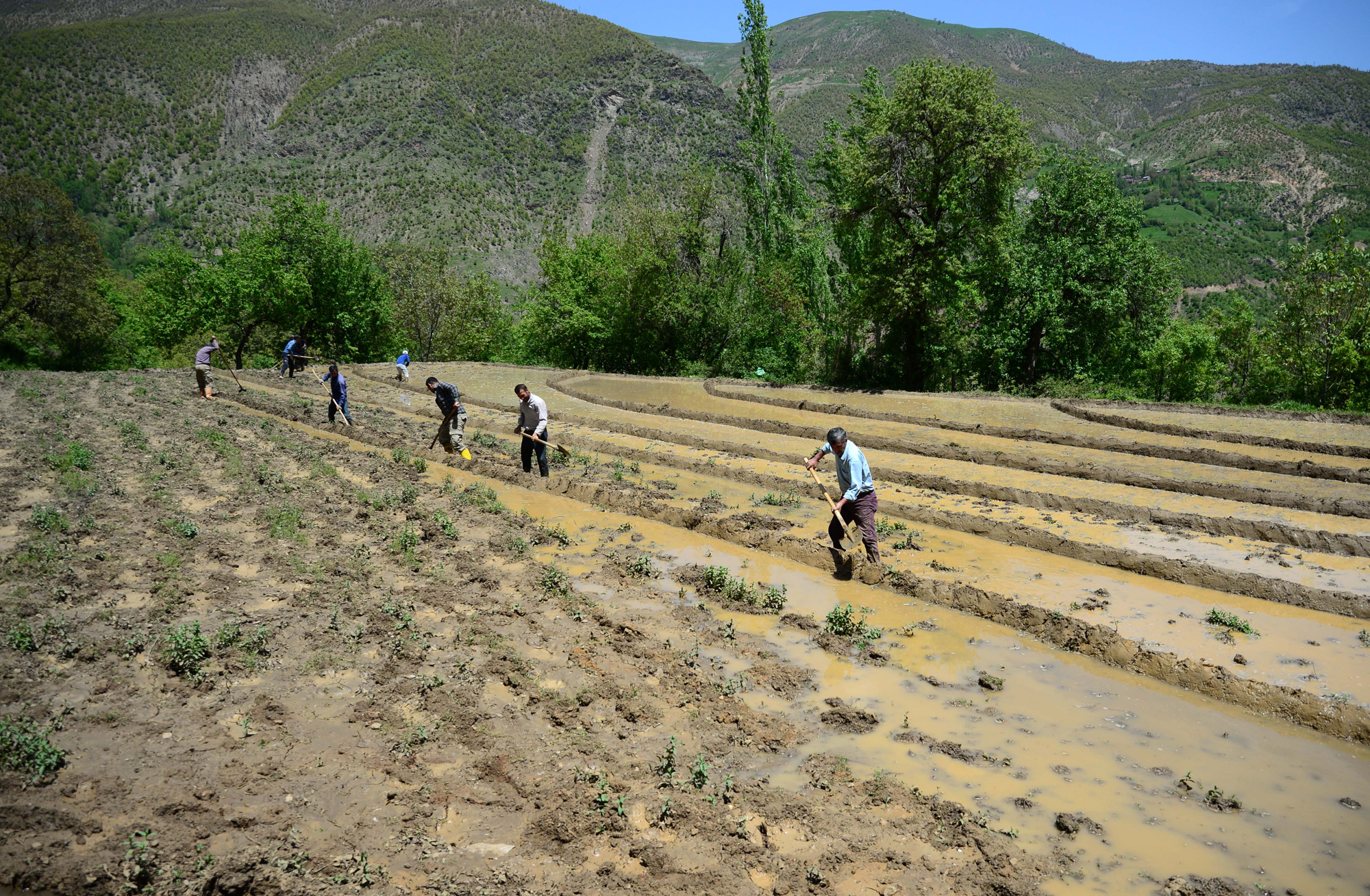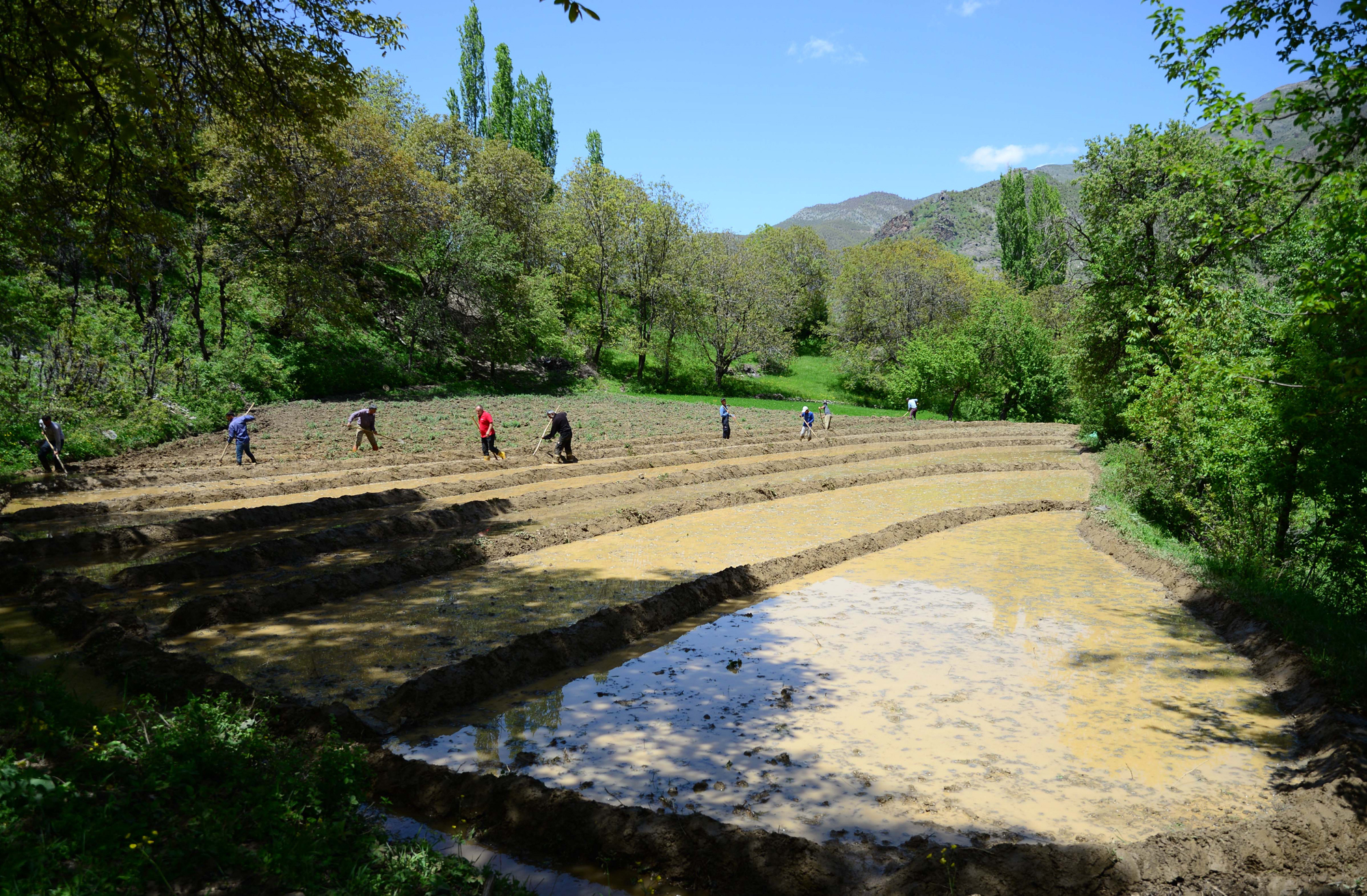 Yüksek rakımlı dağların dik yamaçlarında yer alan köy ve mezralardaki vatandaşlar, atalarından kalma geleneksel yöntemlerle güneşin altında imece usulüyle pirinç ekiyor.