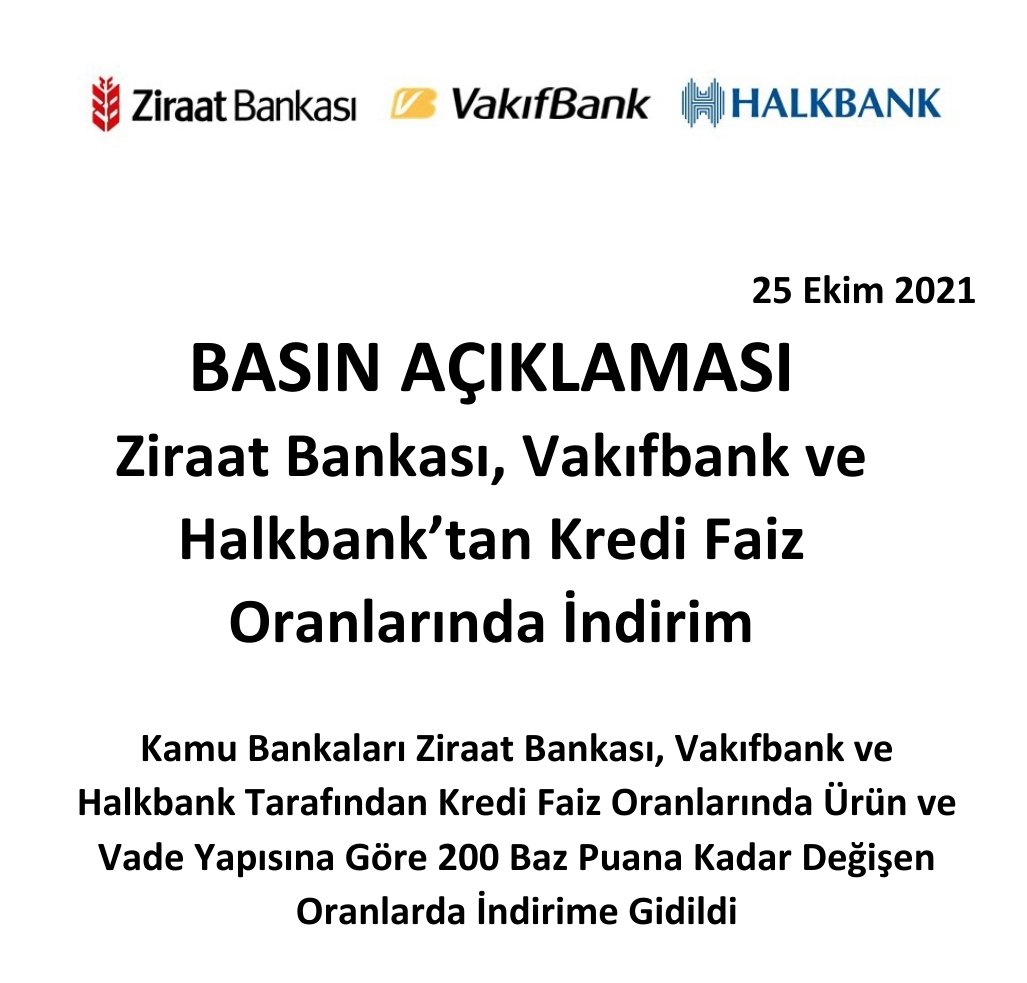 Ziraat Bankası, VakıfBank ve Halkbank tarafından yapılan ortak açıklamada, 22 Ekim itibarıyla kurumsal kredi faiz oranlarında ürün ve vade yapısına göre 200 baz puana kadar indirim yapıldığı belirtildi.