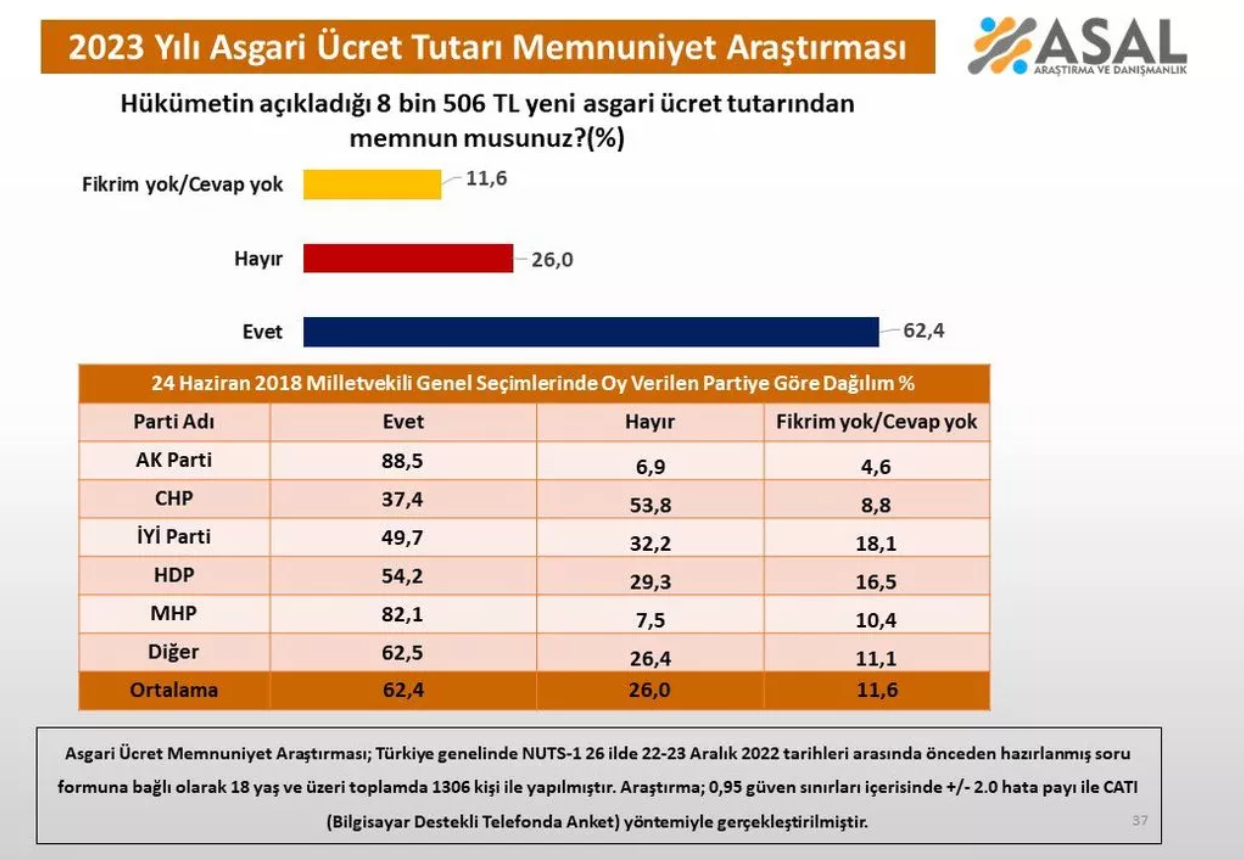 Asgari Ücret Memnuniyet Araştırması; Türkiye genelinde NUTS-1 26 ilde 22-23 Aralık 2022 tarihleri arasında önceden hazırlanmış soru formuna bağlı olarak 18 yaş ve üzeri toplamda 1306 kişi ile yapıldı.