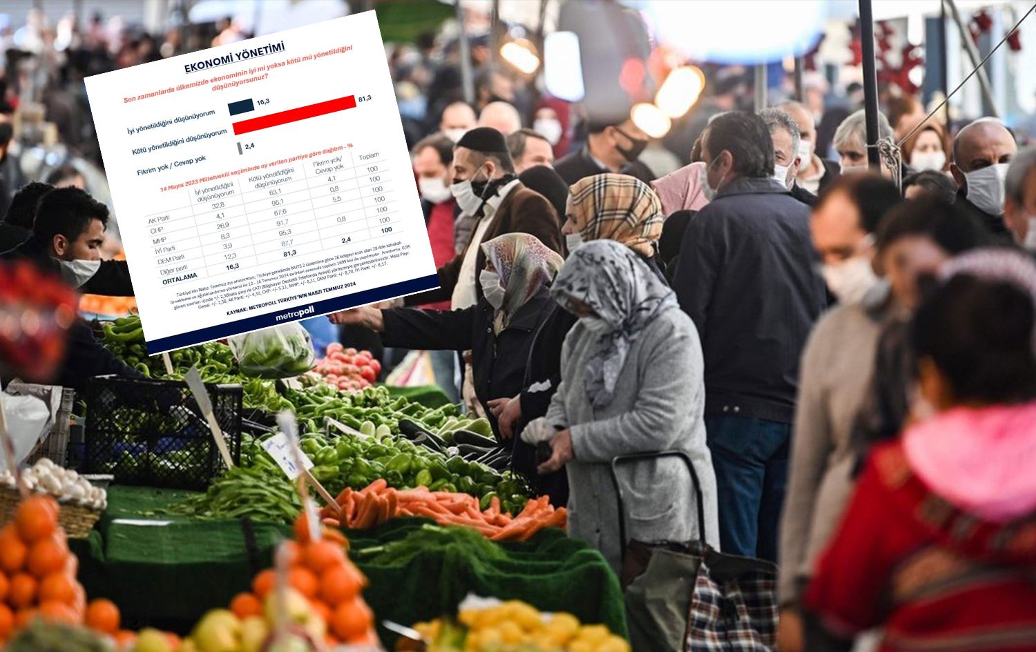 MetroPOLL Araştırma'nın kurucusu ve yöneticisi Özer Sencar'ın paylaştığı ankete göre, toplumun sadece yüzde 16'sı ekonominin iyi yönetildiğini düşünüyor. Ekonominin kötü yönetildiğini düşünenlerin oranı ise yüzde 81,3'ü buluyor. AK Parti ve MHP seçmeninin de üçte ikisi, ekonominin kötü yönetildiğini belirtti.