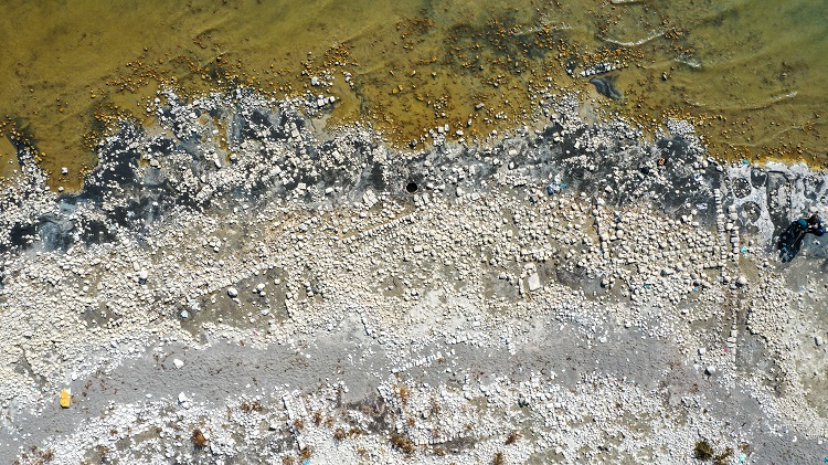 Tarihi kalıntıların daha önce mikrobiyalitlerinin (dikit) görünür hale geldiği kıyı bölgelerinde eski yerleşim alanlarına ait yapı kalıntıları da ortaya çıkıyor.