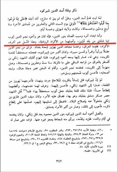 Eserin Arapça metinde Selahaddin-i Eyyubi’nin babası Necmeddin Eyyub ile amcası Şêrko’dan (Eseduddîn) bahsedilen kısımda “İkisinin soyu da Revvadi Kürtlerine dayanır. Bu hanedan Kürtlerin en soylu hanedanıdır” diye yazıyor.