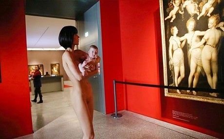 Moire, LWL Sanat ve Kültür Müzesi’nden düzenlenen etkinlikte, çırılçıplak soyunarak kucağına aldığı çıplak bebekle, sergideki tablolar arasında dolaştı.