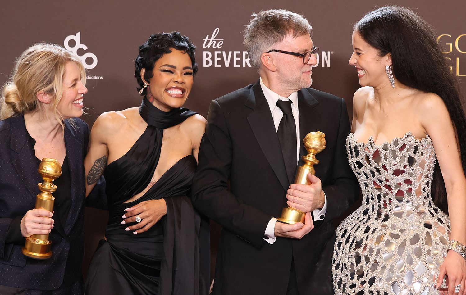 Müzikal/Komedi Dalında En İyi Film ödülünü alan "One Battle After Another" filminin yönetmen ve oyuncuları. / Foto: Etienne Laurent / AFP
