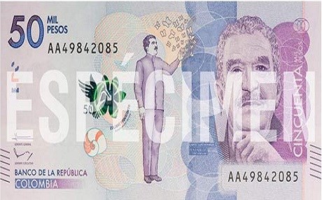 Banknotun bir yüzünde yazarın fotoğrafı, diğer yüzünde de ülkedeki Sierra Nevada dağında bulunan tarihi “Kayıp Şehir”deki Tayrona kültürüne ait iki yerlinin resmi bulunuyor.