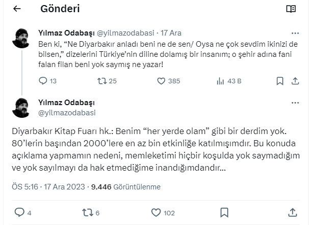 Diyarbakırlı şair, yazar ve gazeteci Yılmaz Odabaşı, 16 Aralık'ta başlayan ve 24 Aralık'a kadar devam edecek olan Diyarbakır Kitap Fuarı'na davet edilmediği için X üzerinden tepki göstermişti.