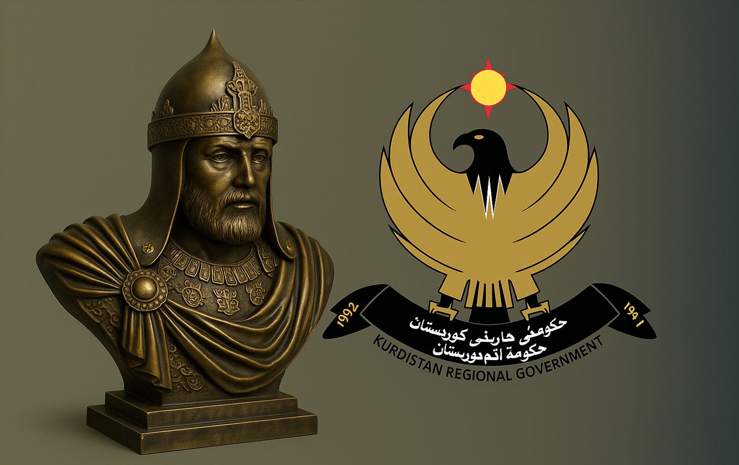 Heykeltıraş Murat Alınak tarafından yapılan Sultan Selahaddin Eyyubi büstü(sağda) Kürdistan Bölgesi logosu(solda)