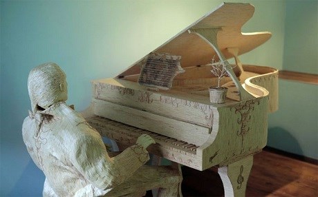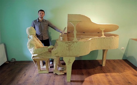 Gerçek boyutta bir piyano ve piyanisti canlandırdığı heykeli için 210 bin kibrit çöpü kullandı. Heykelin ağırlığı 100 kilogram.