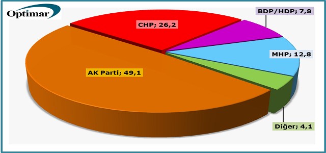 Ankara (Rûdaw) – Ankara merkezli Optimar Araştırma’nın yaptığı son ankette, Türkiye’de 7 Haziran’da yapılacak seçimlerde AK Parti’ye yüzde 49.1, HDP’ye ise yüzde 7.8 oy tahmini çıktı.
