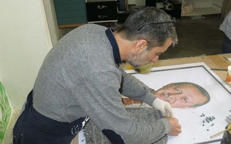 Urfa’da 30 yıldır taş yontma ve süsleme ustası olan Müslüm Çobanoğlu ile Halis Demir, küçük mermer taşlarını bir araya getirerek, Recep Tayyip Erdoğan'ın portresini işliyor.