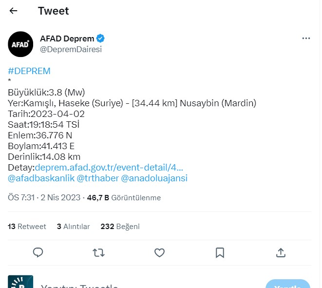 — Kandilli Rasathanesi (@Kandilli_info) April 2, 2023