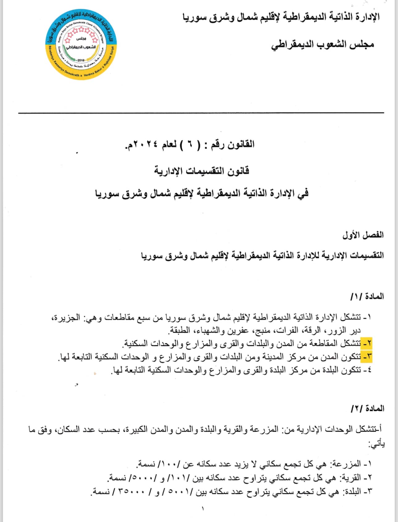 Rojava Özerk Yönetimi (Kuzey ve Doğu Suriye) İdari Bölgeler Kanunu 30 Nisan’da Halklar Meclisi tarafından onaylanarak yürürlüğe konuldu.