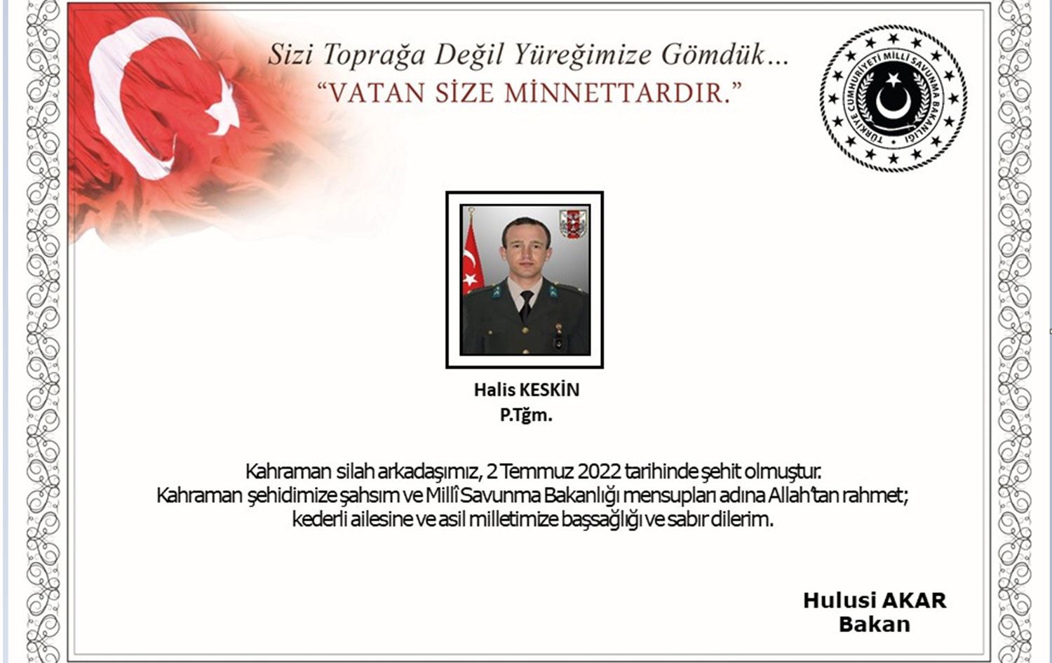 Türkiye savunma Bakanlığı’ndan yapılan açıklamada, Derecik (Rubarok) ilçesinde kaçakçılık olayına müdahale eden unsurda görevli Teğmen Halis Keskin'in Barazgir (Hezir) Çayı'na düşerek ağır yaralandığı, hızla hastaneye sevk edilip tedavisine başlandığı ancak tüm müdahalelere rağmen kurtarılamadığı belirtildi.