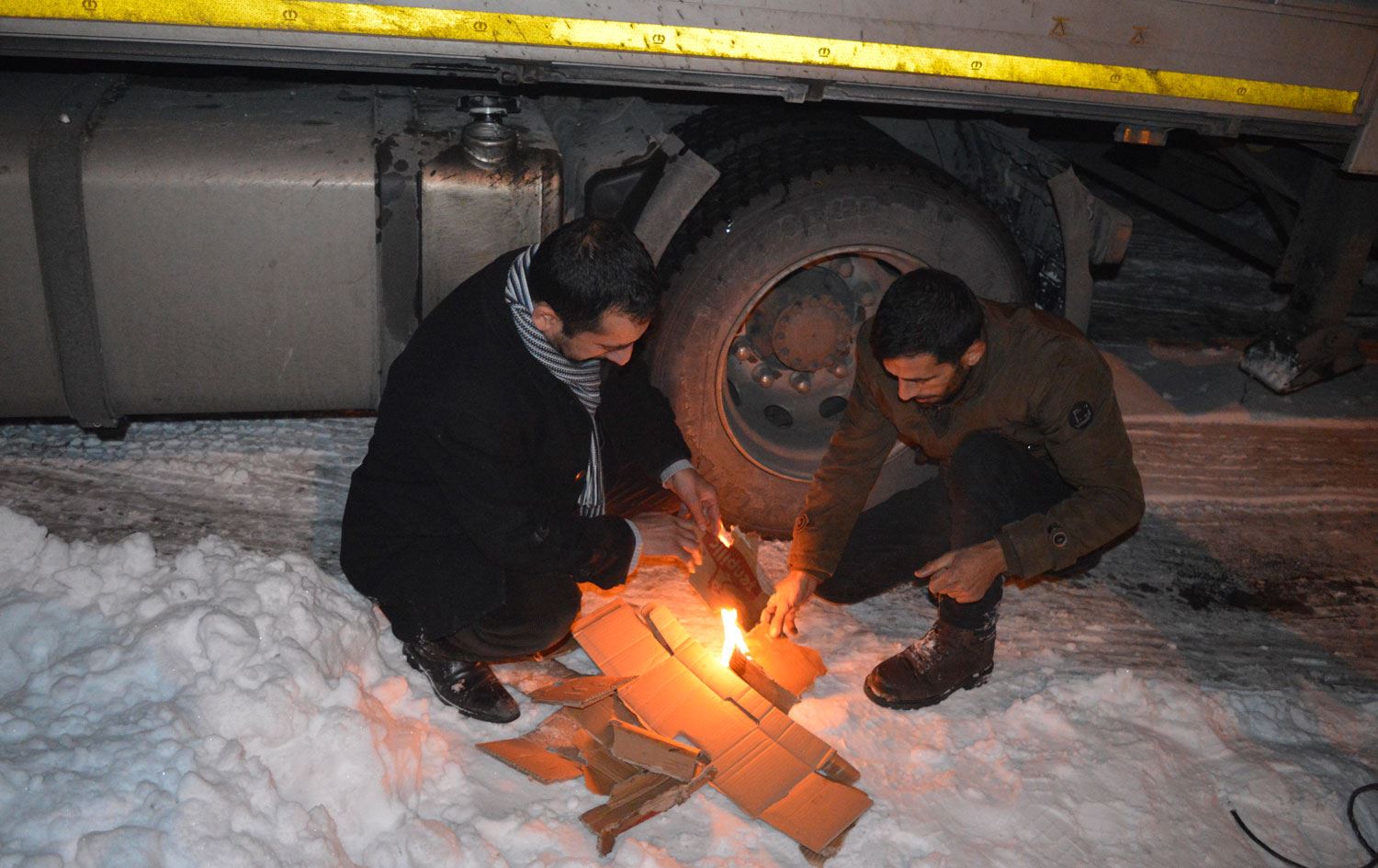 Dinlenme tesislerinde bekleyen tır şoförleri, gece boyunca yakıt depolarının altında ateş yakıp, her iki saatte bir araçlarını çalıştırarak, araçlarının donmaması için önlem almaya çalıştı.