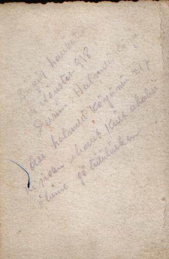 "2. Ordu, 6. Kor, 41. Tümen, 19. Alay, 1. Tabur, 3. Bölük erlerinden Mehmet oğlu Mahmut, Kayseri 1330(Miladi 1926) doğumlu. Alay komutanımız Feyzullah Barzan, tabur komutanımız Binbaşı Hüsnü Yalım, bölük komutanımız ise Mustafa Yavuz'du."