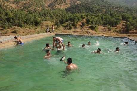 Sıcaktan bunalan çiftçiler, bölgede bulunan yüzme havuzuna girerek, serinliyor.