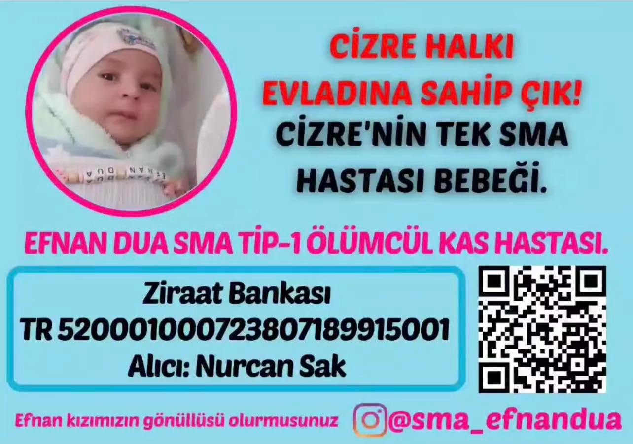 Erbil (Rûdaw) – Şırnak'ın Cizre ilçesinde SMA hastası olarak doğan ilk çocuk olan 3 aylık Efnan Dua Sak’ın tedavi edilebilmesi için yardım kampanyası başlatıldı.