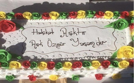 Öğlen saatlerinde bina içinde başlayan etkinlik devam ederken, saat 17.00’de bir araç ile üzerinde, “Hakikat aşktır, aşk özgür yaşamdır” yazılı sarı, karmızı ve yeşil güllerle süslenmiş bir pasta getirildi.
